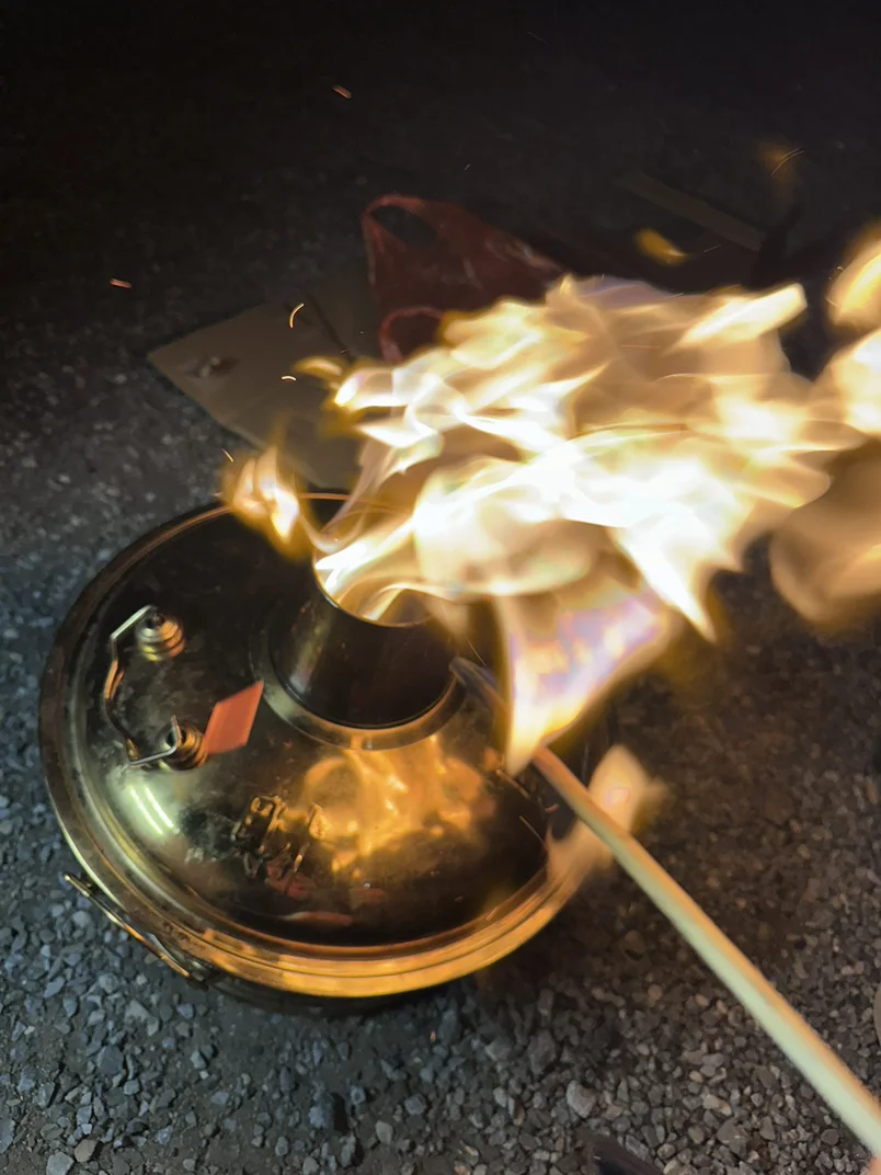 一开始风还是有点大,打火机打了五六次才点着,我们还拿车挡了挡风。水一开,先下肥牛卷和丸子,热气腾腾的香味一下子就飘出来了。