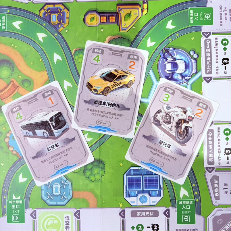 其次卡牌玩法无门槛易上手,小学一年级的小朋友也能快速融入;游戏里融入了“碳排放”核心概念,每一步行动都会影响你的碳值,瞬间让玩法有了目标感,不再只是简单掷骰子前进;在抽卡决策、策略博弈中,直观学习不同出行方式的碳排放差异,卡牌上还注明了各种出行方式的碳排放科普效果拉满。