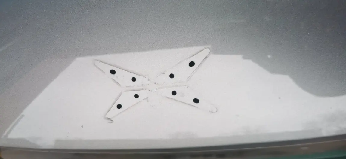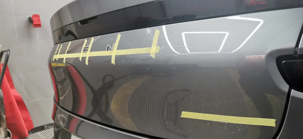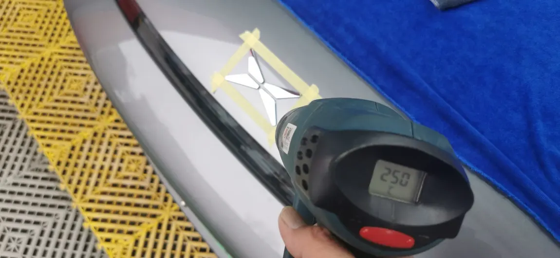 热风枪调至250度,用于软化原车粘胶,再用硬刮板扣下来。车标清除干净,用柏油清洁剂去除残胶,此时效果如下图。