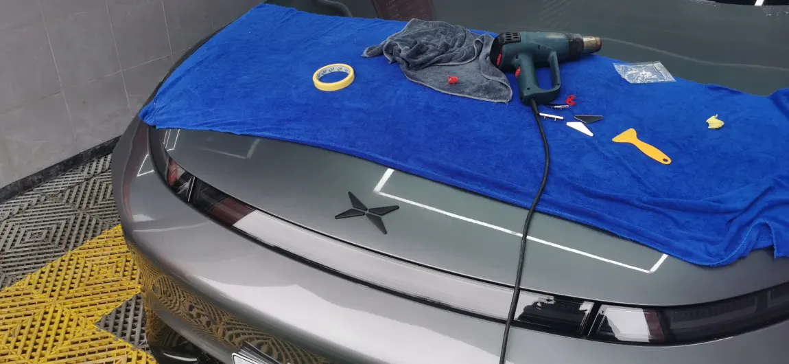 所需工具:火山泥、热风枪、软硬两个刮板、贴膜喷雾、美纹纸,柏油清洁剂😅贴膜是个精细活,为防止开胶,非常有必要使用专业工具施工。所以本次找了个汽车美容店,谈好价格,租用场地工具。