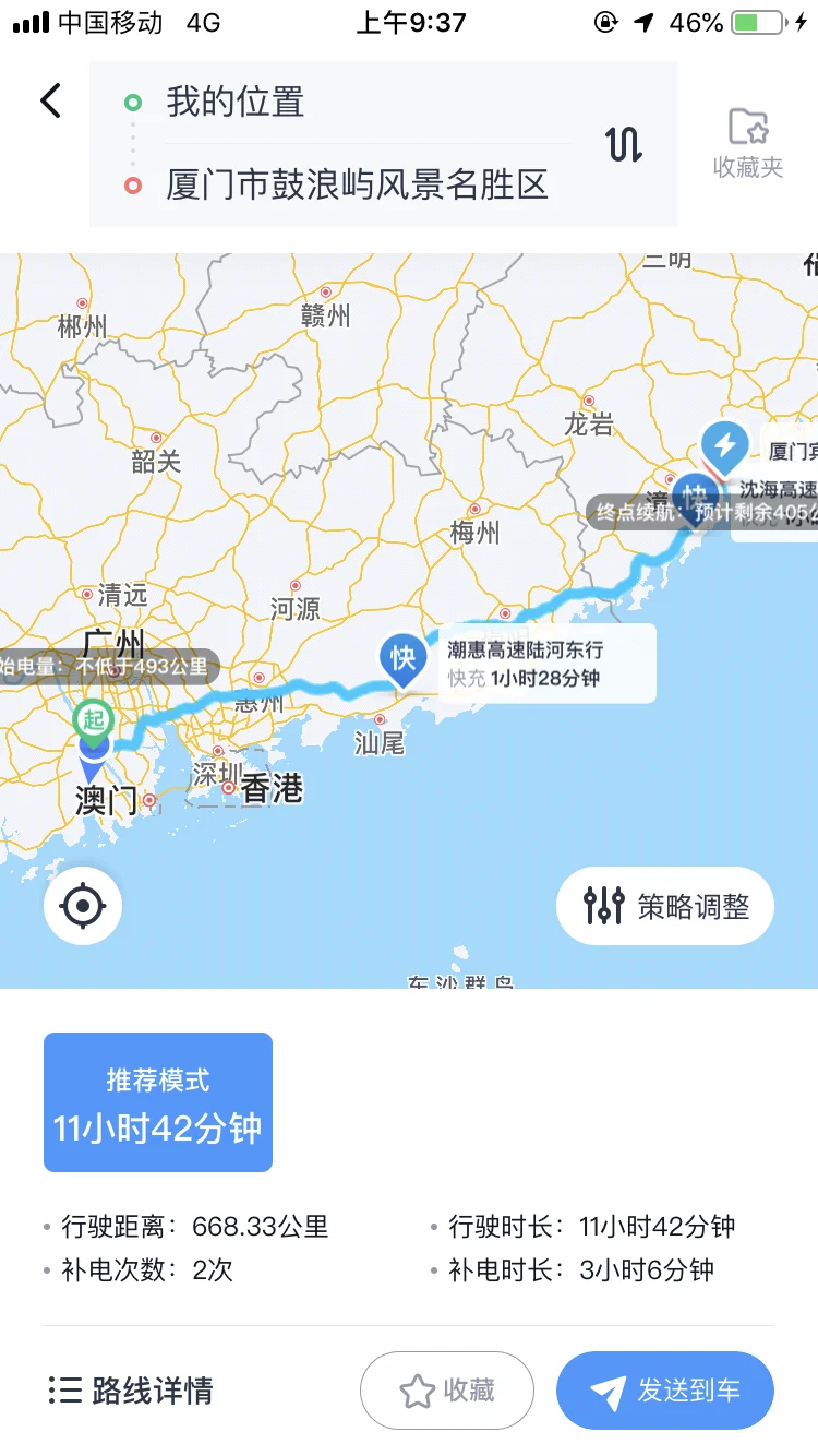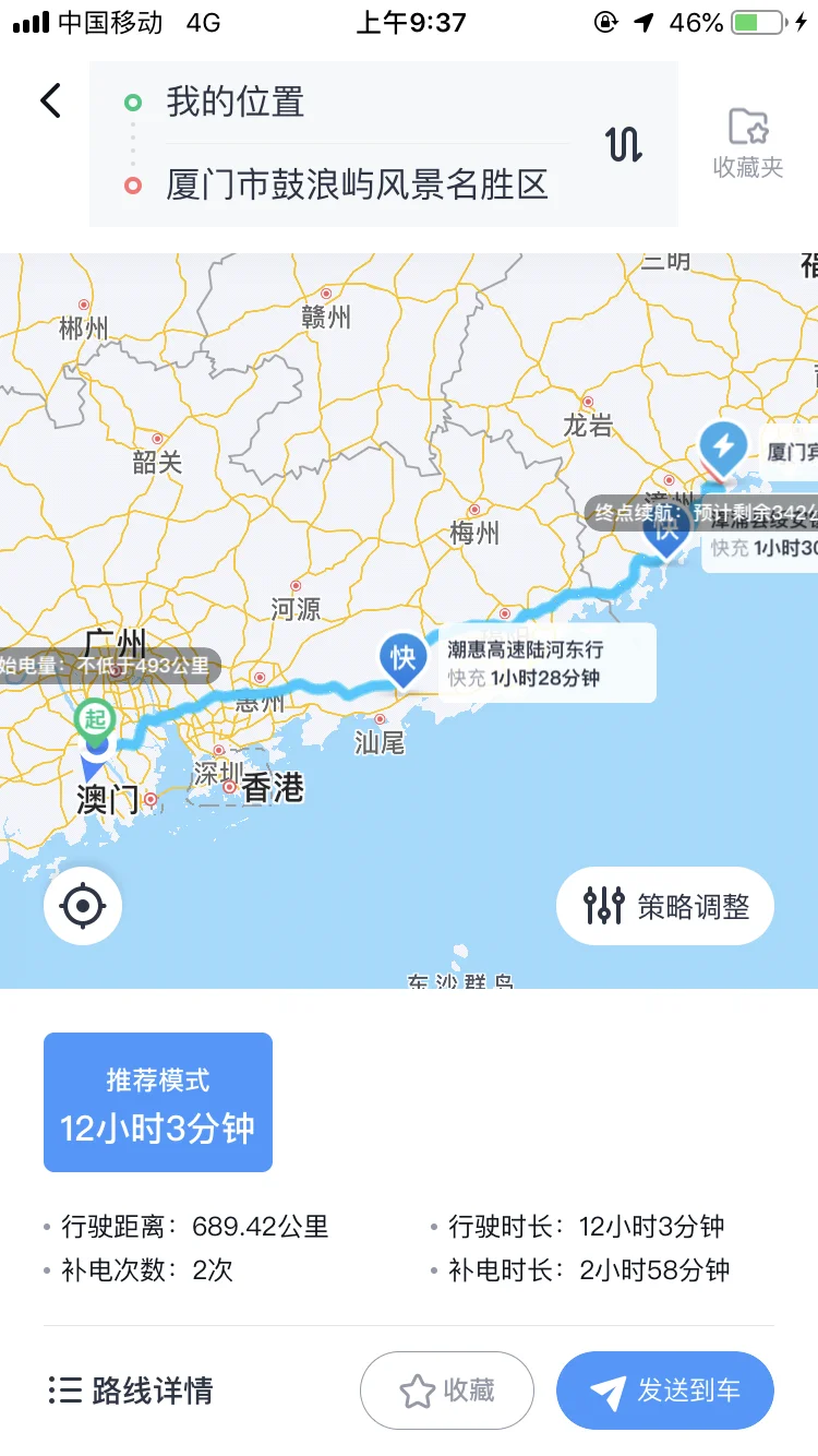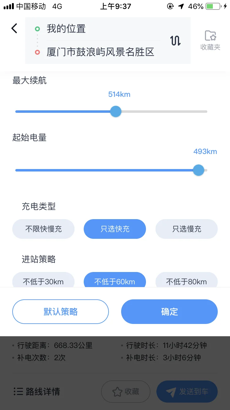 电量行驶tips:最好前一晚充满电到90%,然后在快剩余80km左右的时候就要找快充了,大概1小时内就可以搞掂。