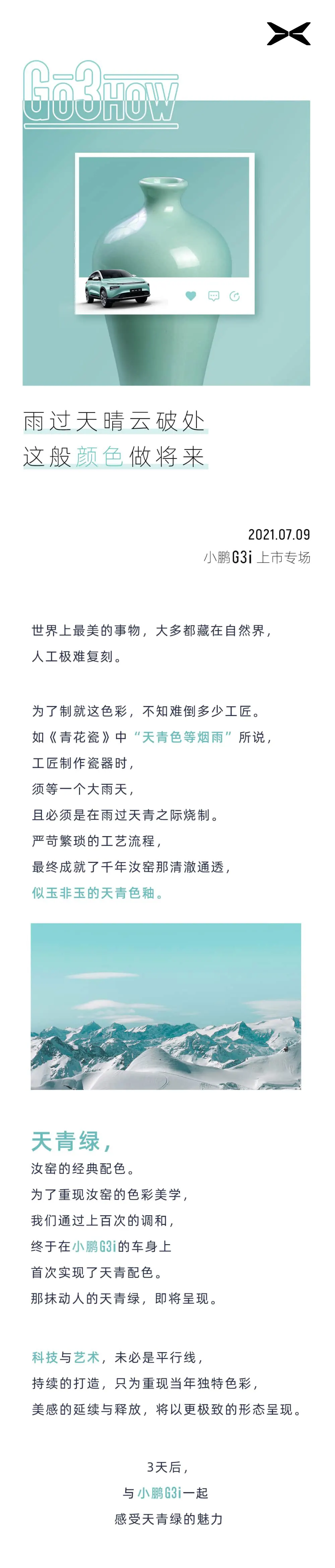 “天青色等烟雨,而我在等你”经过大家的精挑细选,G3i颜色名字最终确定为:天青绿在投票过程中,很多鹏友为这个颜色赋予了淡雅,青春,浪漫的诠释,这代表了大家对G3i的期盼!7.9日与小鹏G3i一起,感受天青绿的魅力!获奖名单将于G3i征文活动结束后公布。#你好,G3i#征文活动正在火热进行中,欢迎大家踊跃参与#你好,G3i# #OTA体验# #智能座舱#