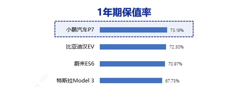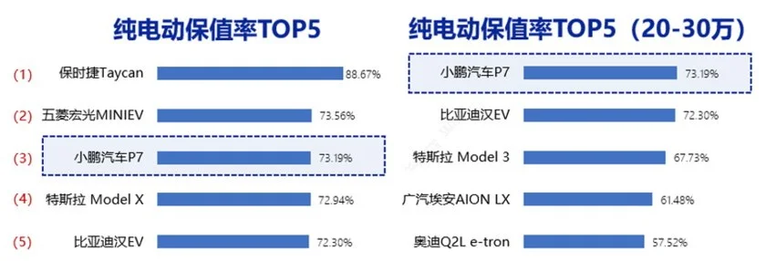 在近期发布的《2021年度中国汽车保值率排行榜》中,小鹏P7以73.19%的保值率排在了纯电动保值率榜单的第三位,如果再细分下市场,在20-30万这个关注度最高的价格区间的纯电动车保值率榜,小鹏P7可以位列榜首,相比起特斯拉Model 3高了近6%。
