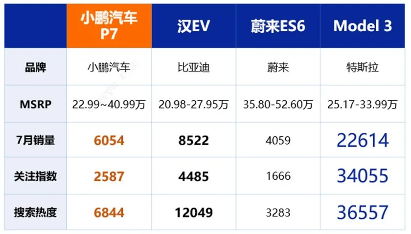 首先是销量,下图是7月的四款车的销量、关注指数和搜索热度的数据,可以看到特斯拉依旧遥遥领先,小鹏P7高于蔚来ES6,但是低于比亚迪汉EV,小鹏P7在新能源汽车销量的总排行中排在第10名,虽然纵观整个市场,这是个不错的销量,但不是其保值率高的致胜原因。