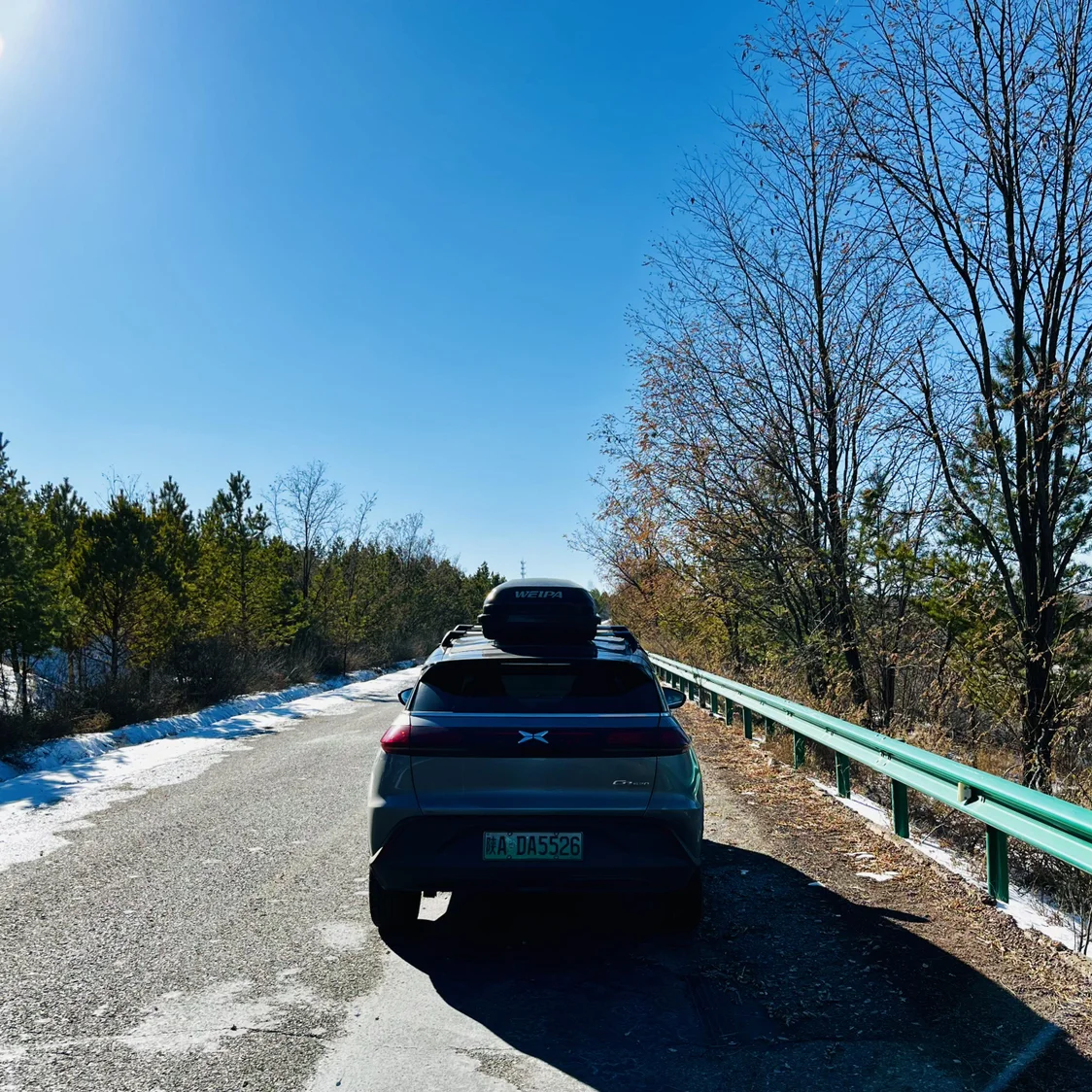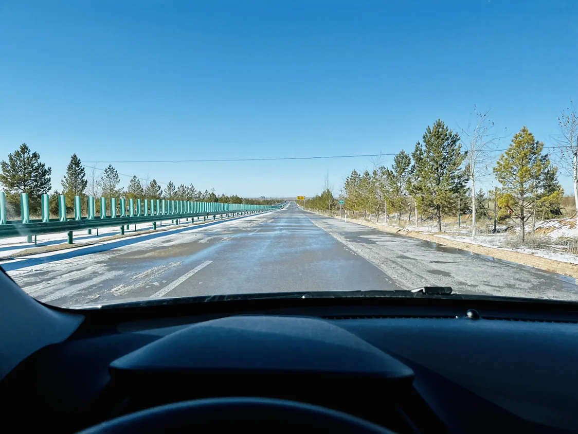 我去往野营地的路上看到道路两边有一些融化的积雪我想等我返程时就会变成湿滑的冰面吧,所以老司机提醒冬季出行尤其是行驶在国道一定要多观察返程对向路段的积雪以及隧道桥梁下的暗冰,做到原路返回时对道路情况知根知底这样才更安全