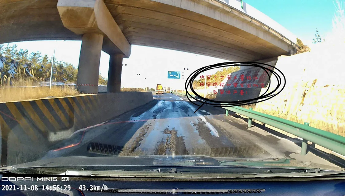 一定要注意桥梁下、隧道口及道路上背山阴暗的位置会有难以被太阳蒸发的冰雪遗留在路面上,这些位置大家一定要注意提前减速切莫盲目超车。