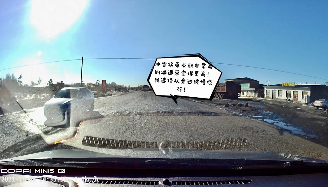 行驶在国道时某些减速带附近会有大型车辆通过减速带时撒落的积雪和冰块也要格外注意,尤其是有较高减速带的路上一定要注意减速带是否由于积雪增加了高度而引起托底。