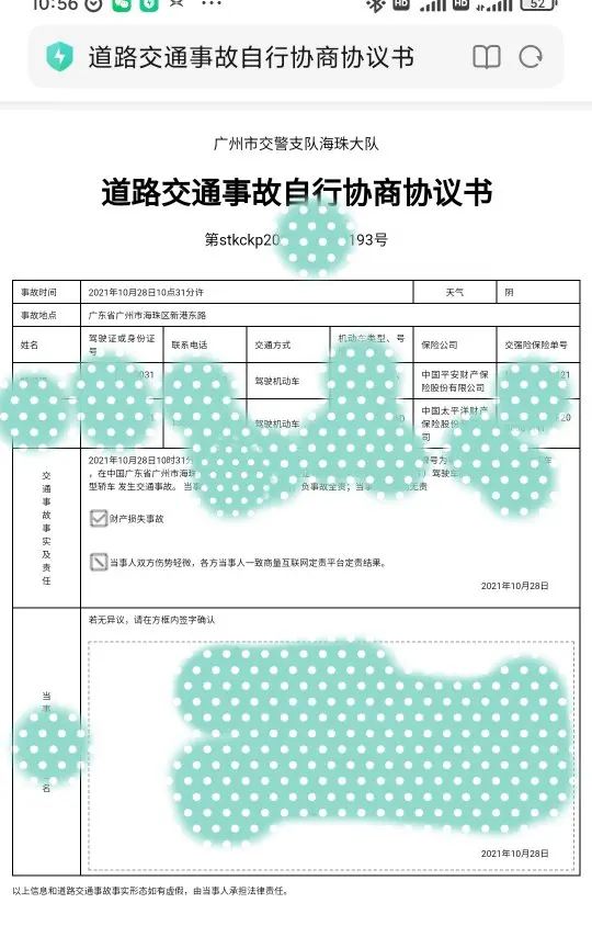 然后双方再次收到一条短信,点击链接进入,就可以看到合并的双方都有签字的协议书。凭这个协议书在一年内就可以去维修了。另外还需要拿到对方保险的报案号,这个需要跟对方拿,一般对方有收到保险公司的短信。第一次没经验,不知道要拿这个号。