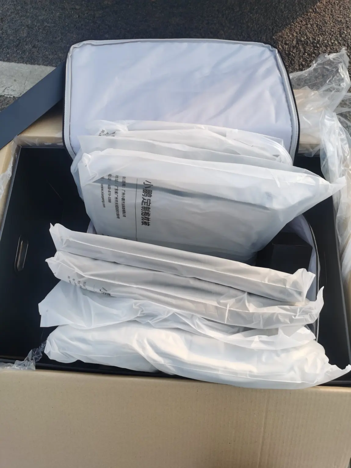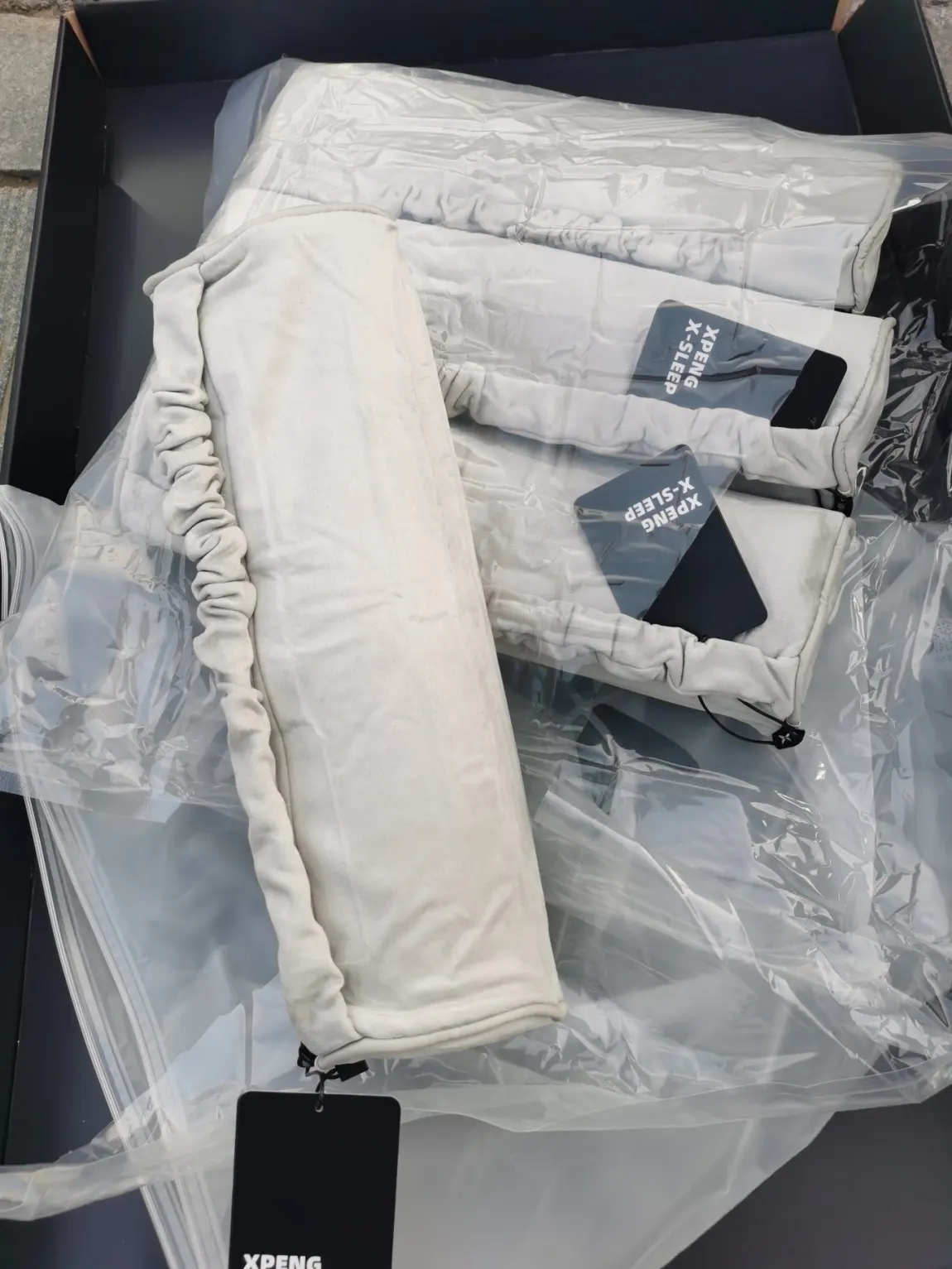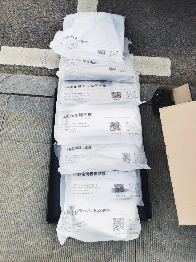 小鹏赠送的睡眠套装一直躺在后备箱里,空间占用了很大,准备搬走,利用第二次免费快充时,闲来无事,开箱验货吧。