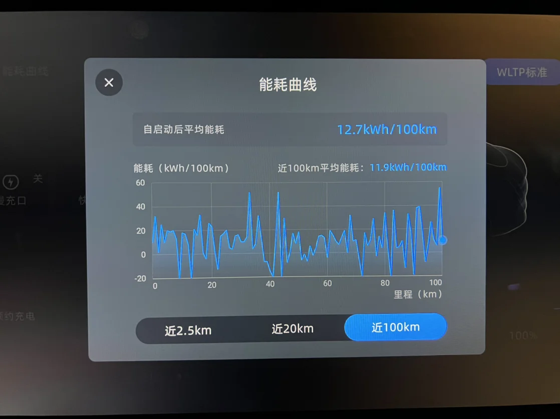 上周日把P7充满100%后,出门溜达。到晚上12点左右回到家看了一眼剩余电量404km,刚好消耗掉100km的电量(586版本充满100%后WLTP模式续航为504km)。