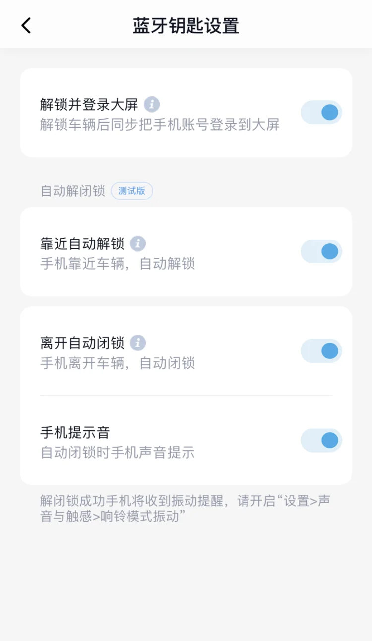 ②蓝牙钥匙还不够灵敏,我设置的是靠近开锁,离开锁车模式。