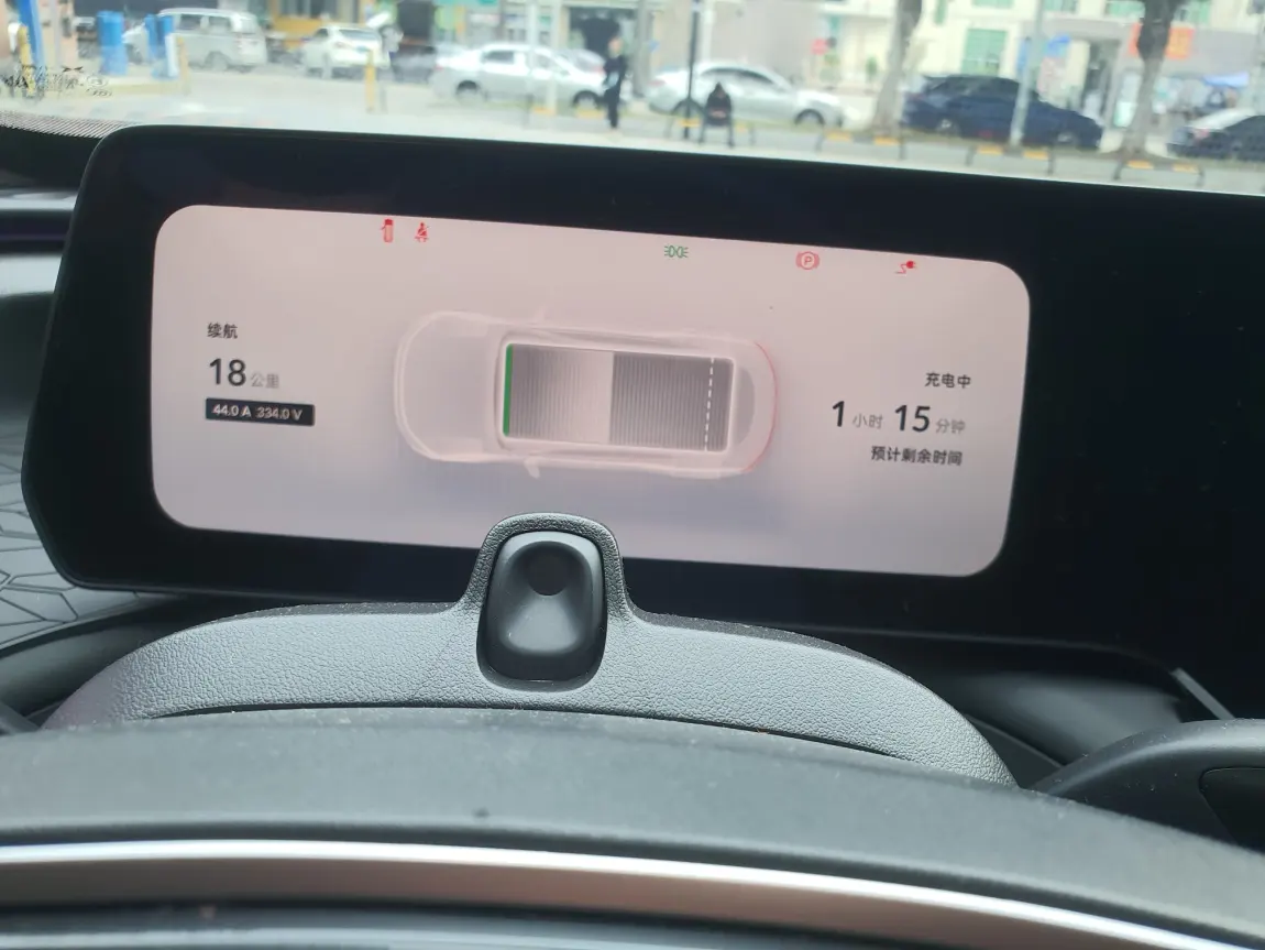 快充90%+慢充10%,充满100%显示576km,实际跑了接近557km,剩余里程表显不显示,插电后提示剩18km,实际续航打99折。