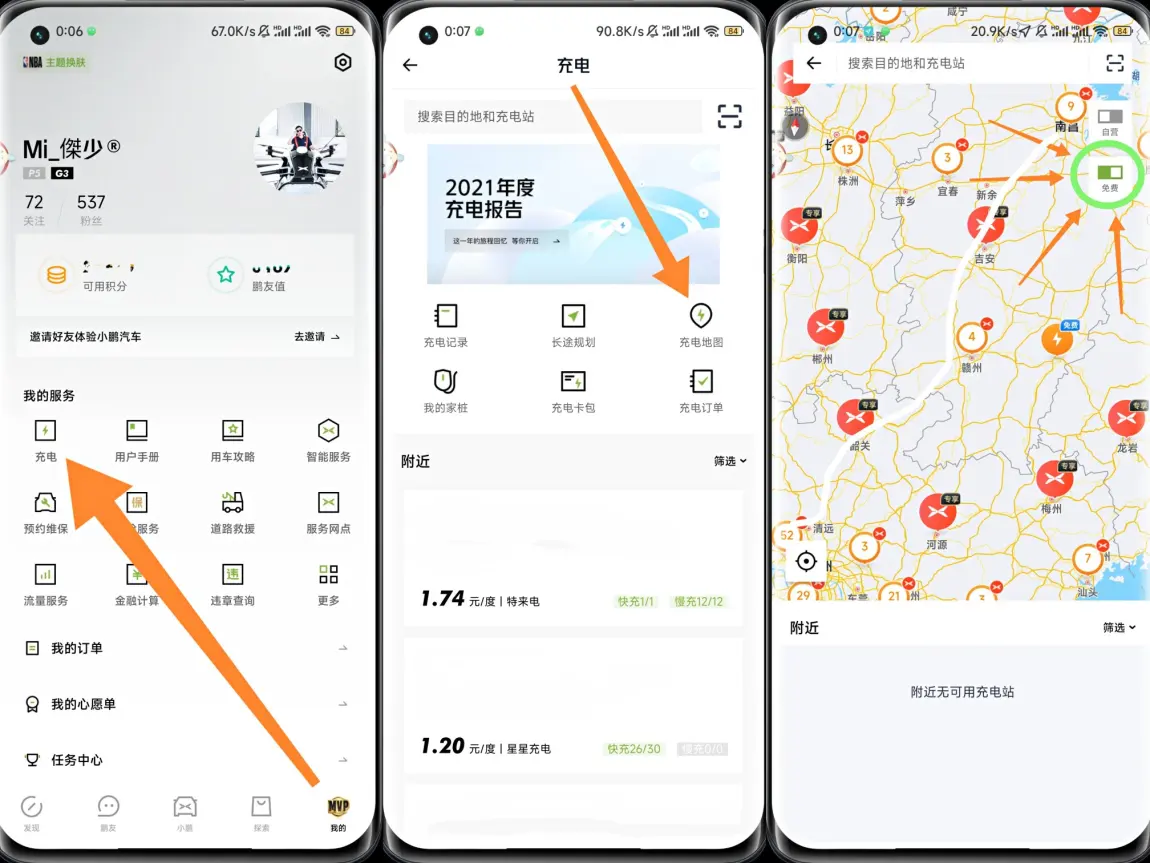 小鹏app-我的-充电-充电地图-选择筛选免费站