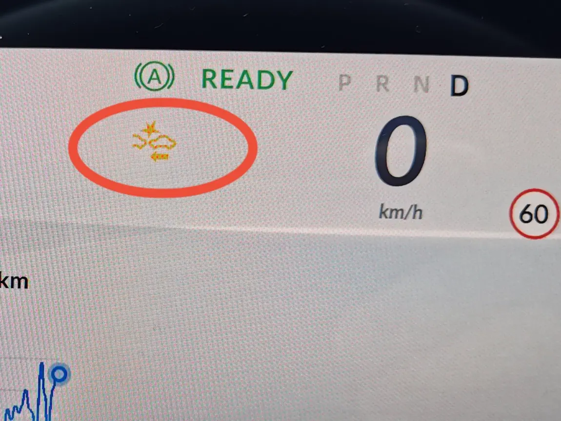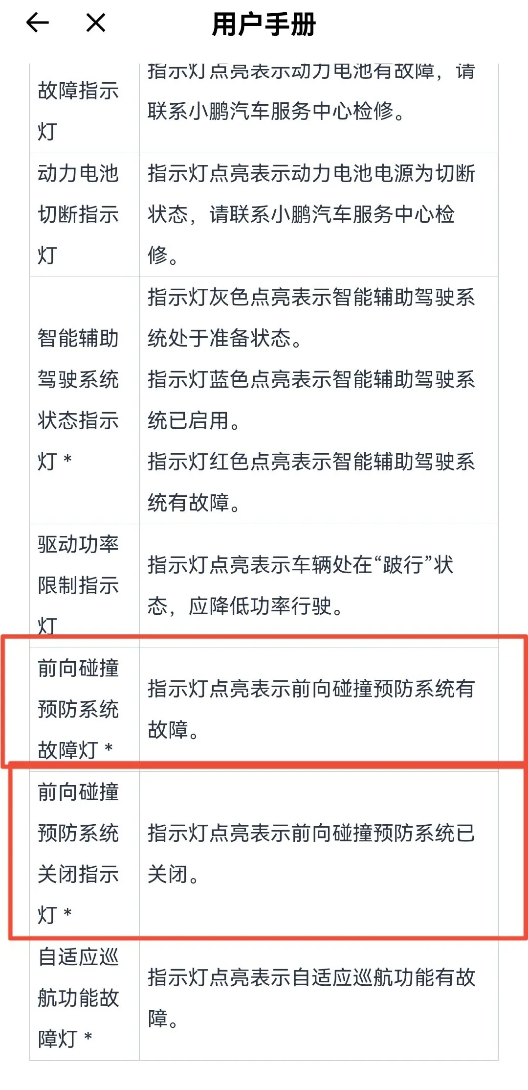 根据用户手册描述,上图所示指示灯,是由于前向摄像头和雷达被雨雪糊住了,导致前向碰撞预警失效。