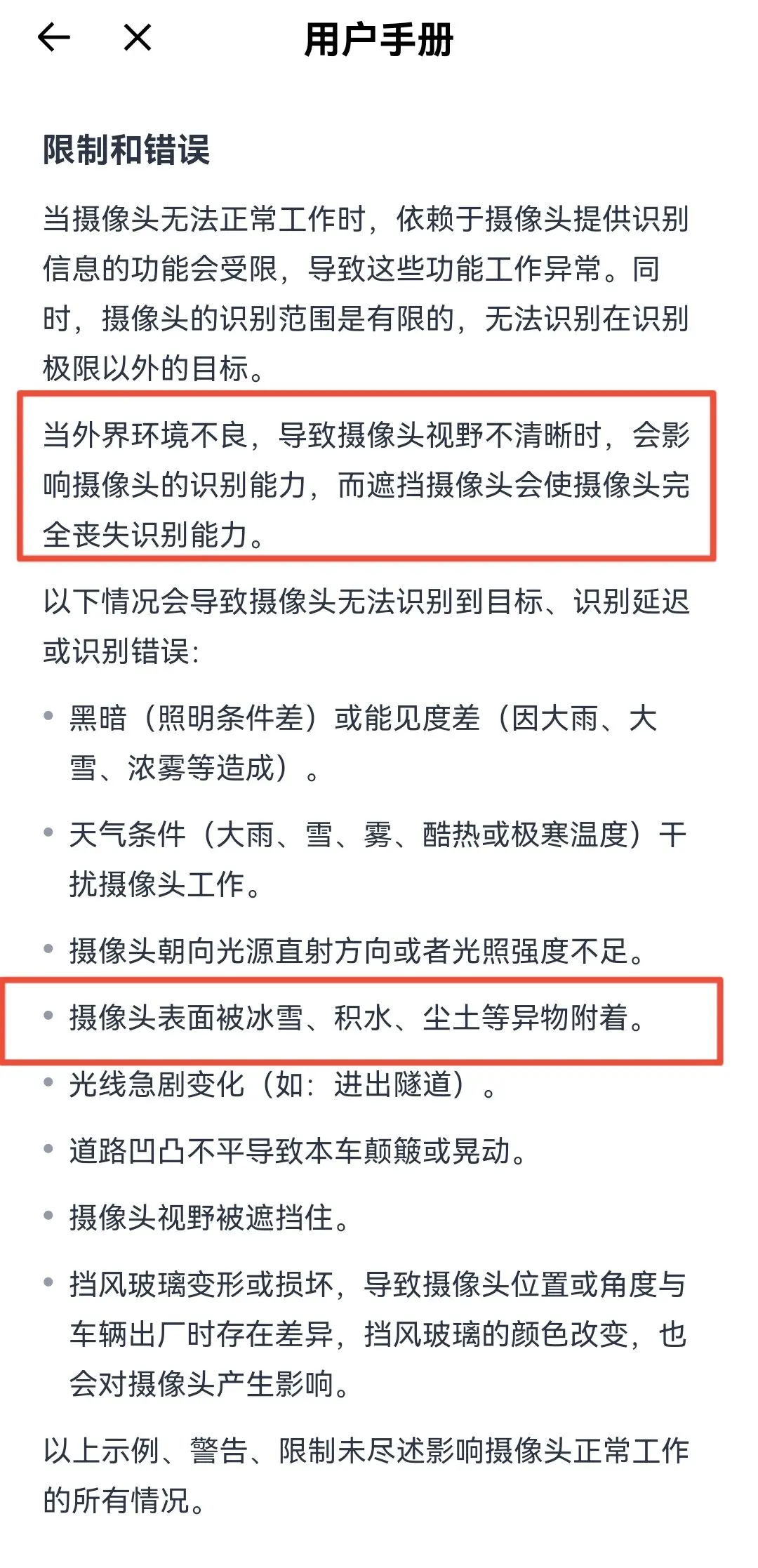 看车友群,反映最多的也是这个问题,解决方法很简单,把挡住摄像头和雷达的雪,清理掉即可。
