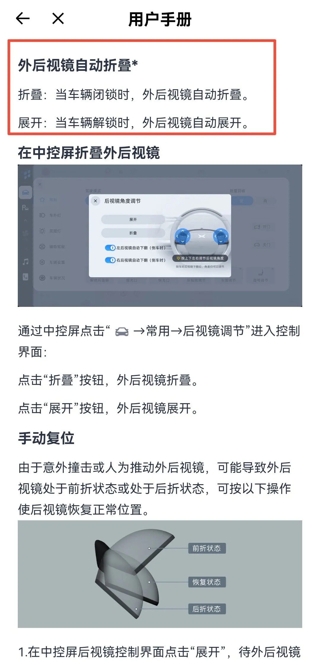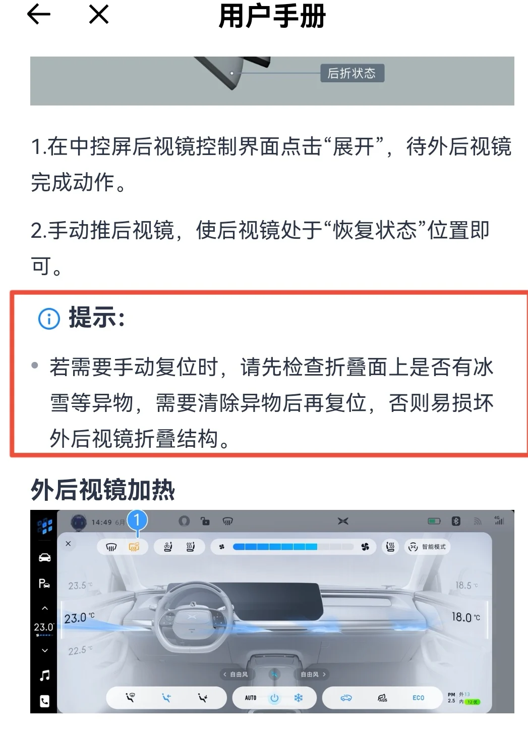 最后,一点建议,外后视镜两个耳朵,锁车不支持展开,建议后期OTA更新。因为这种大雪天气,后视镜会被冻住,车辆解锁时,导致不能从折叠顺利展开。需要清理积雪,再打开。如果可以锁车时保持展开状态,就会免去这些问题。