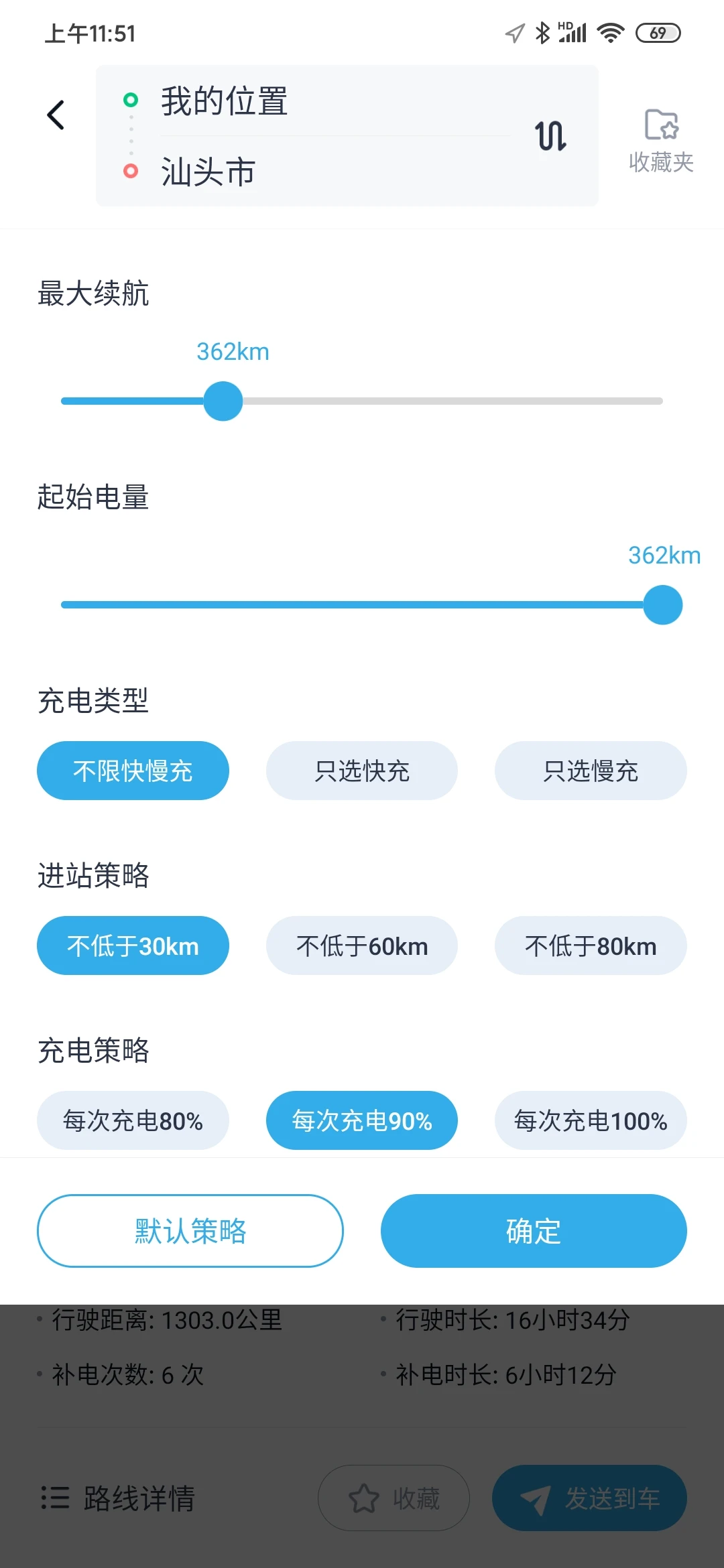 还有就是最重要的长途规划功能,这个功能非常好,感觉类似于蔚来加电里的路径规划,但是功能应该比加电更细心,因为增加了策略选择功能,可以选择车辆的快充,慢充选择,车辆提前的进站策略,比如说是保守一点,还是激进一点。还有车辆行驶的情况,比如荷载一人和坐满四个人肯定是有区别的。我觉得这些细节很不错,非常值得推荐。
