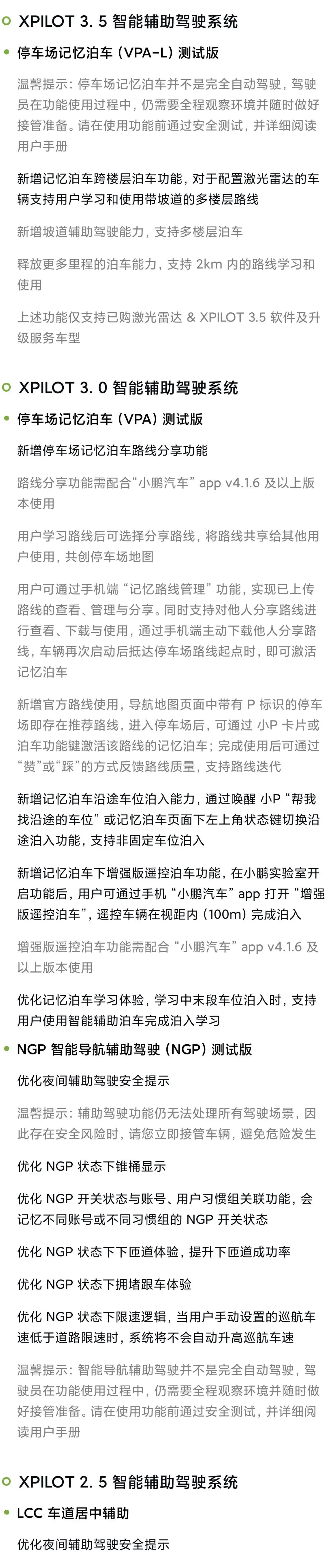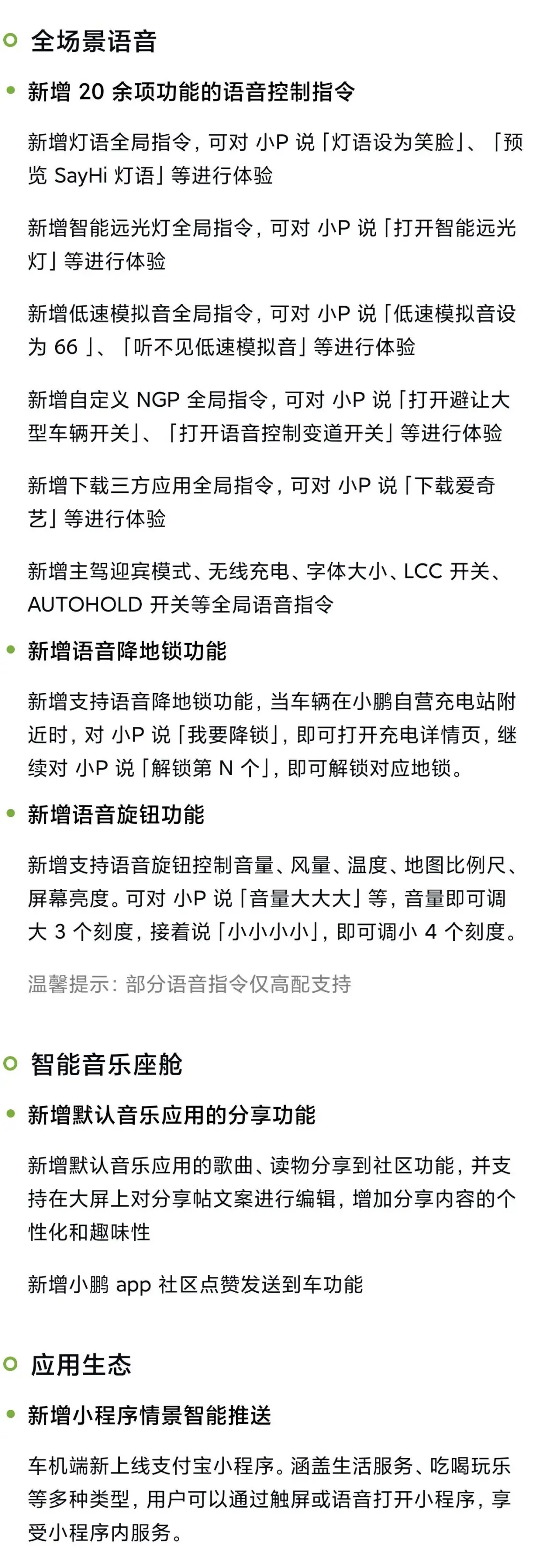 更多体验改善性优化交给鹏友们探索发现,升级与使用该版本过程中遇到的任何问题,可拨打400或前往小鹏社区OTA频道中的建议版块反馈,所有参与本次公测的鹏友,均可获得20鹏友值。