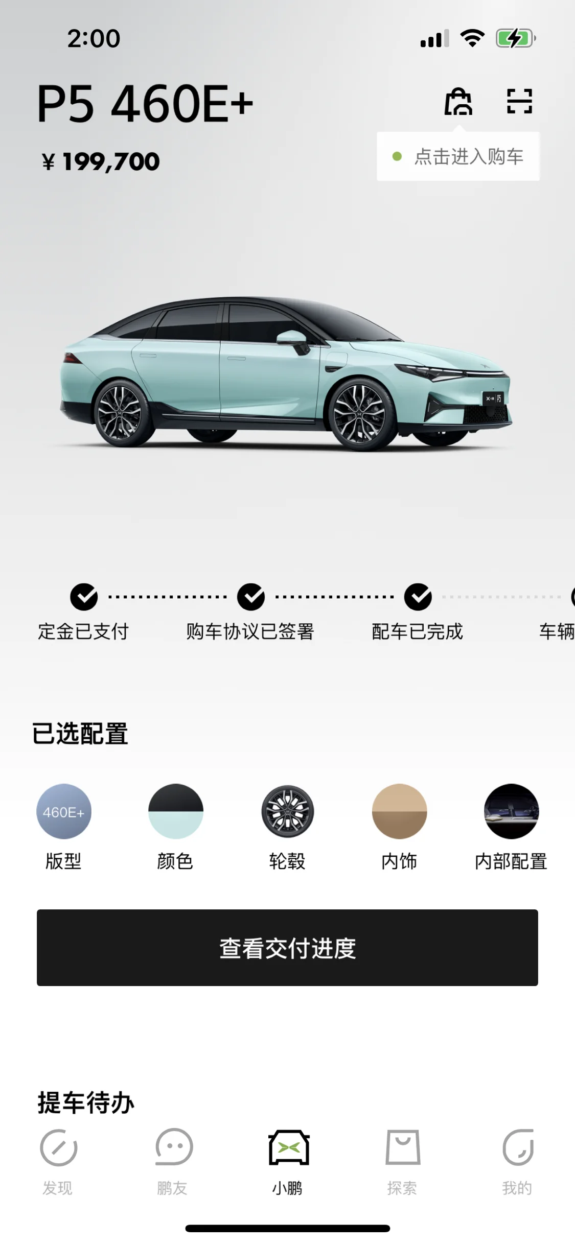 #P5提车作业# 忍不住再分享一遍配车的喜悦,10月24日签合同买的p5 460E,一直都没有配车,2月16日销售小哥给我说改配可以早提车,于是2月17日签署改配合同,变成了460E➕,27号打电话问客服啥时候配车,说是5月,又问交付专员,说3月底,没想到啊!昨晚睡不着,一打开就配车完成了!太惊喜!果然攒够了失望给点糖就会忘记苦等的苦了!但总得来说能提车还是快乐的!各位都改配了吗?都配车了吗?