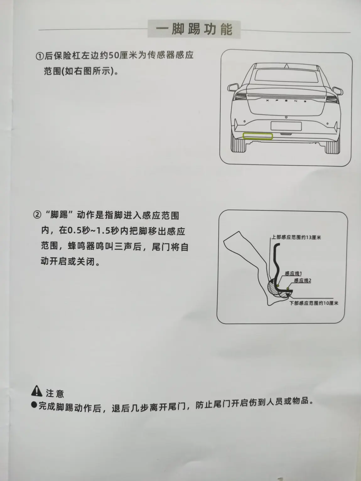 一、脚踢功能,在后保险杠左边约50厘米为传感器 感应范围,当脚进入感应范围0.5-1.5秒内,蜂鸣器鸣叫三声后,尾门自动开启或关闭。