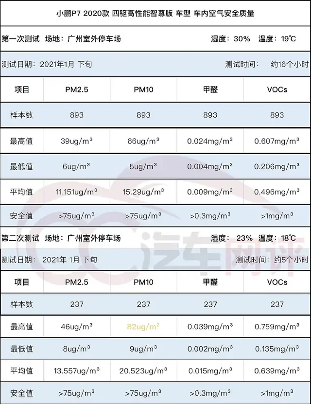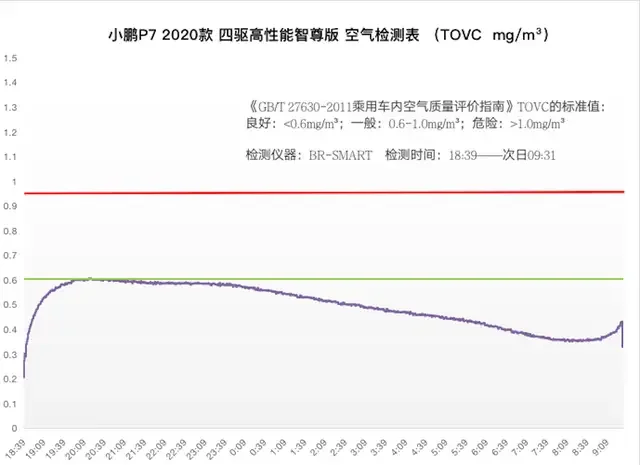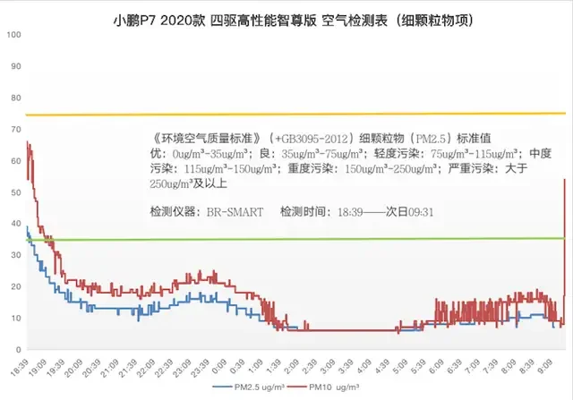参与本次车内空气质量测量的测试车辆「小鹏P7 2020款 四驱高性能智尊版」的行驶里程为17554km,在室外停车场的环境对测试车辆「小鹏P7 2020款 四驱高性能智尊版」分别做了约16小时和约5小时的车内空气质量数据收集,其中16小时的长测时段,是在下午18:39至次日上午09:31进行;5小时短测时段,于上午14:39至下午18:35进行。两个测试时段的选择,模拟的是日常通勤用车后停车的时间,以及周末外出停车时段的场景。使用的测量仪器为:BR-SMART (使用过程中远离香水、酒精或其他化学物环境);