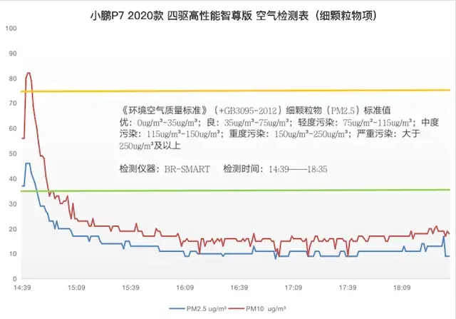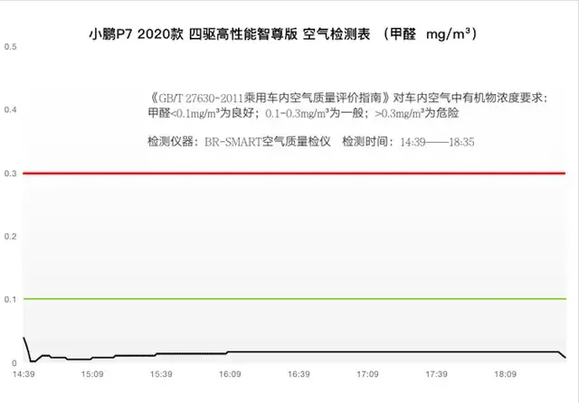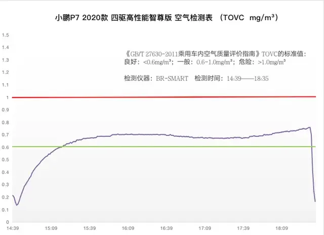 3、《GB/T 27630-2011乘用车内空气质量评价指南#选择P7的十万个理由# 》TOVC的标准值。测试车辆的车内细颗粒物质含量在关闭车门后,均会在短时间内沉降至《环境空气质量标准》(+GB3095-2012)细颗粒物(PM2.5)中的「优秀标准」,长测数据中用时分别为7分钟(PM2.5)和31分钟(PM10),短测数据中分别用时为8分钟(PM2.5)和15分钟(PM10)。测试车辆的车内甲醛含量整体波动平稳,数据较有变化的部分是短测数据中14:47分至16:09的阶段,以当日天气情况而言,该时段是天气温度升高变化量较为明显的时段,故车内甲醛含量的整体数据在该时段中有较明显变化。到18:31分时段打开车门后,车内甲醛含量也有明显降低。