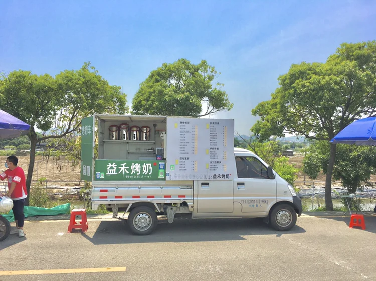 岛上环岛道路上,面对大航道水面的那道路边上,有各色各样的小吃小摊,这益禾烤奶的改装车哈哈哈,笑到了。