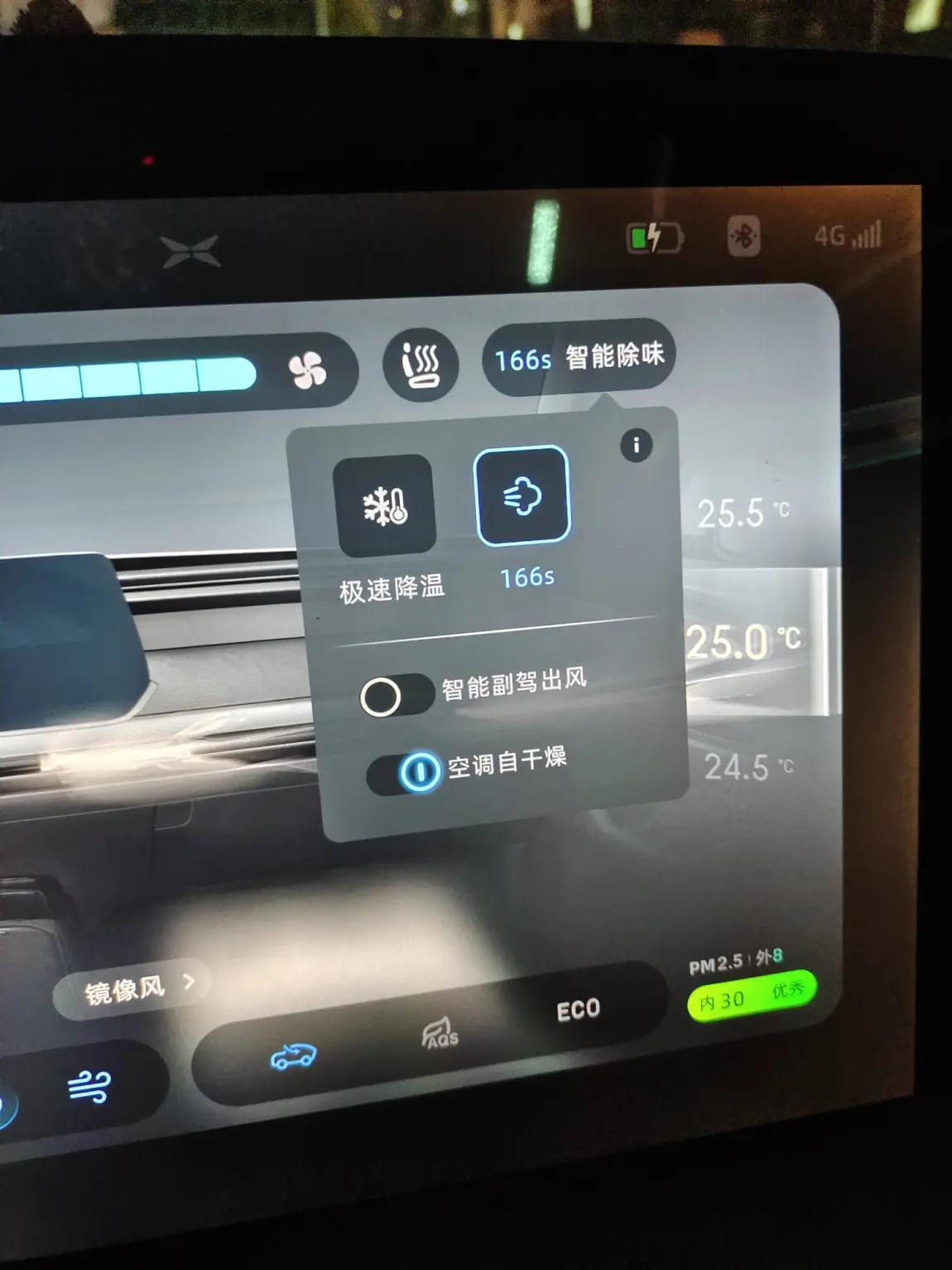 很多新鹏友说、停车后咋还呼呼呼的吹风呢、其实这是小鹏的空调自干燥功能。在停车后空调继续吹,吹干冷凝管的水分,防止细菌的有效滋生,减少异味的产生!
