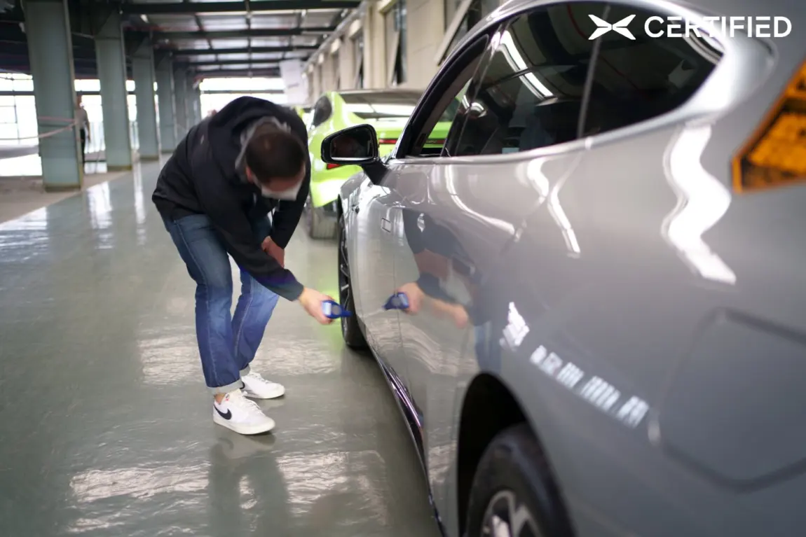 和评估的小哥聊天。小哥表示一天之内没评估过这么多车子。评得一身汗。