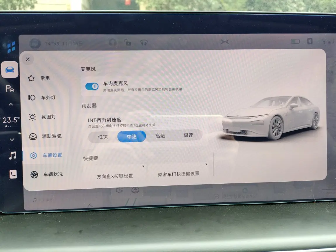 INT档雨刮器速度调节方法:点车图标☞车辆设置↓下拉到雨刮器,然后选择亲需要的速度就好啦。