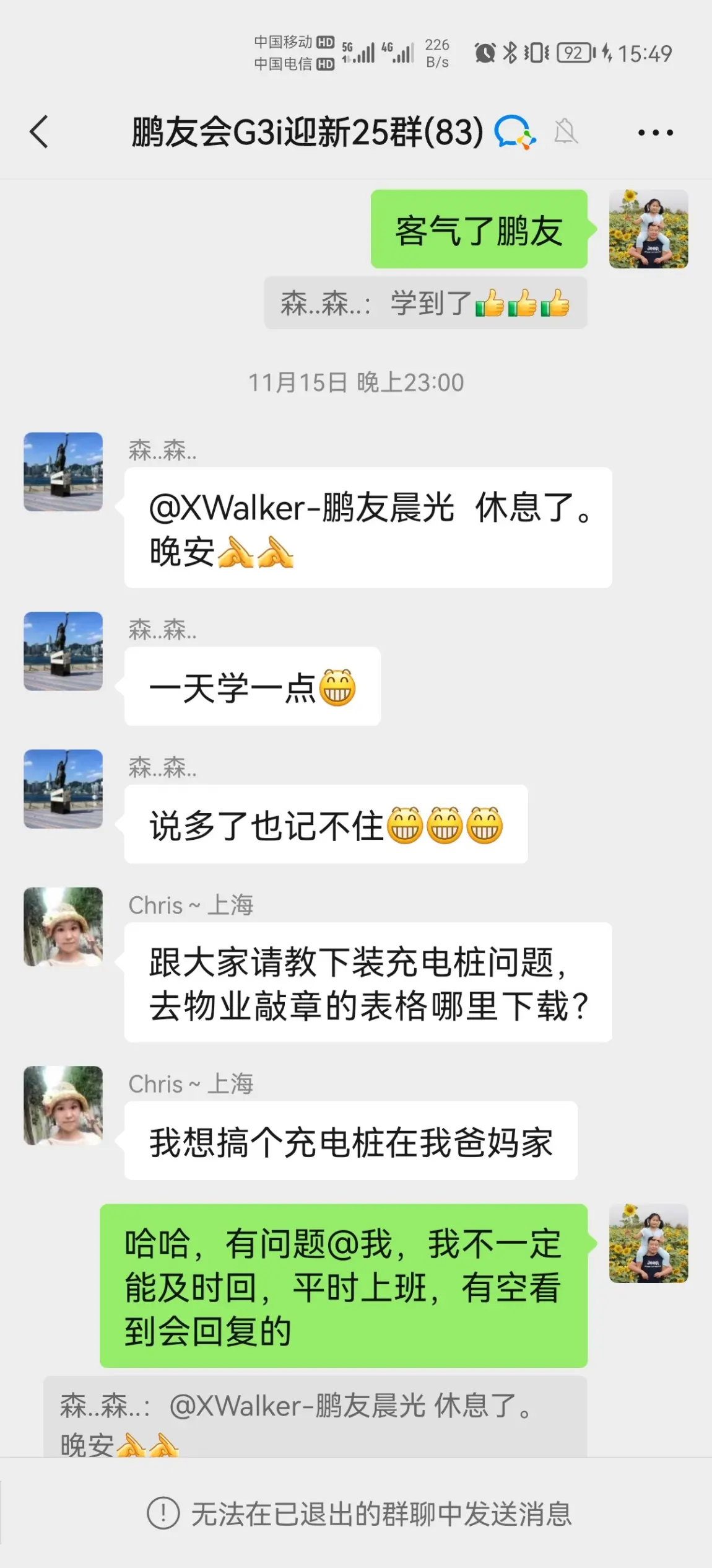 在鹏友会G3i迎新25群里,分享用车经验的时间虽然短,但凝聚了本地老司机@淡定沉默 @鹏友190716 和小鹏汽车徐州高新区综合服务中心提供的帮助!🌹🌹🌹谢谢!