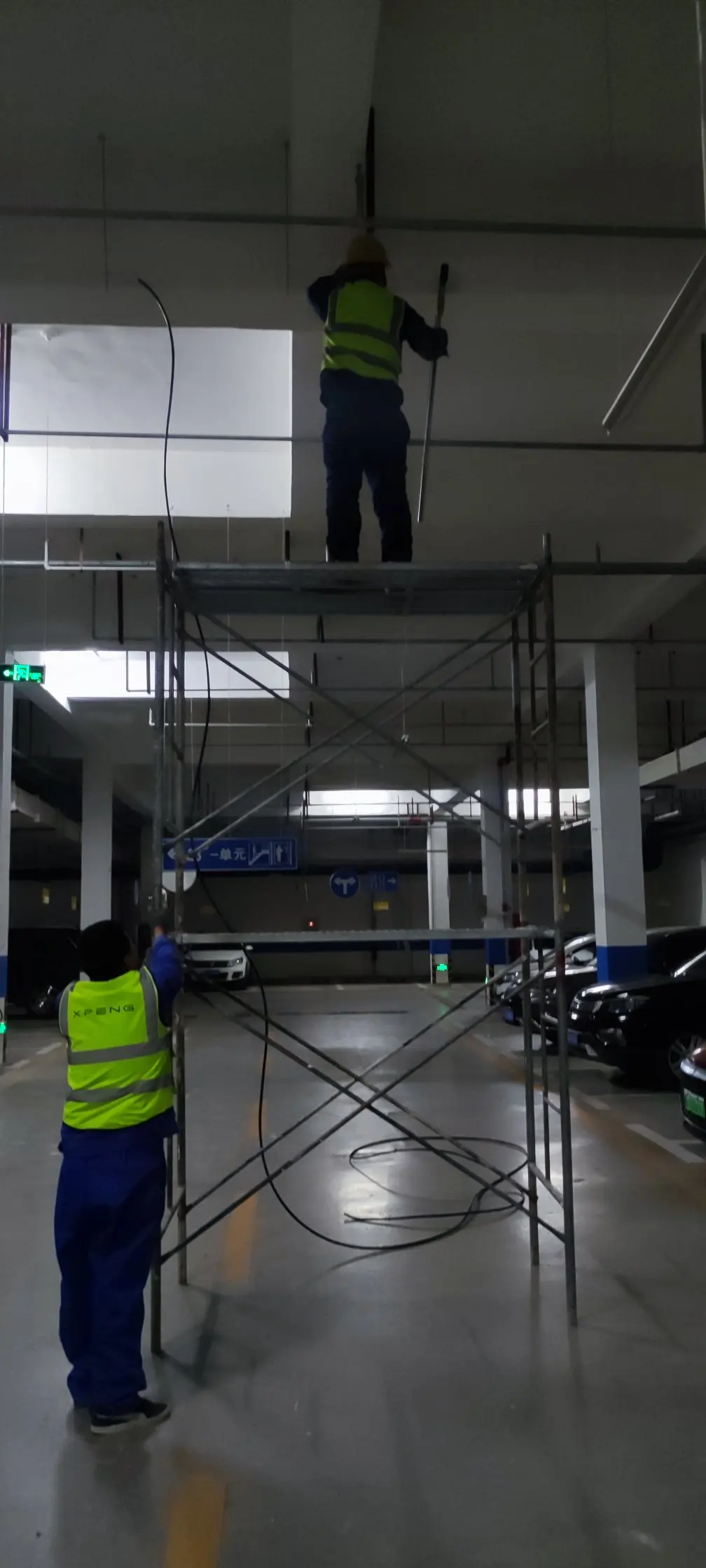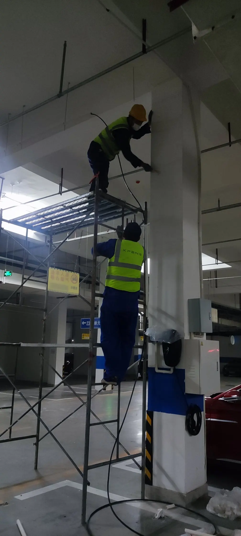 师傅们上门服务很给力,动作还是很专业滴,我们地区没有服务点,所以之前都是通过电话和视频和师傅进行沟通,初步确定走线的方案。到现场后,很快就完成了路线计划和设计,效率很高。我家车位挑高五米,安装难度有点大,需要搭脚手架进行走线,安装师傅很快解决了问题,走线也非常漂亮,完美的完成了安装。