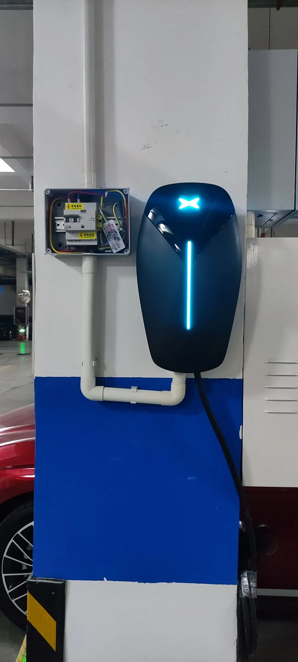 我安装的是二代充电桩,颜值还是在线,尤其是灯亮的时候很好看,但我平时都是关掉,免得吸引别人注意,嘿嘿。充电功率实测基本能到达7kw,详细情况待是有一段时间在做测评。