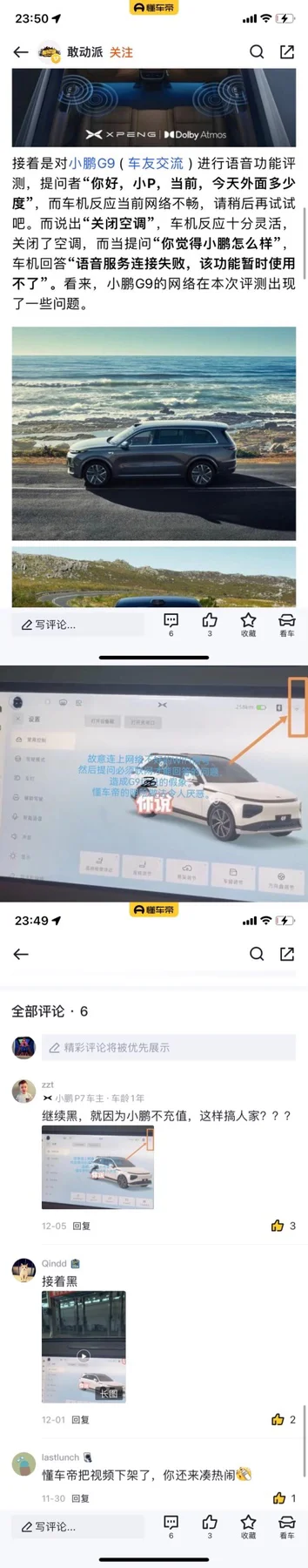 1.横评视频出来之前,发小视频,测蔚来,理想,小鹏的车机,啥的都知道结果,谁不知视频说其他表现都很好,唯独小鹏没有网络,细心的网友发现G9连的是Wifi,那么大个平台发视频能不能严谨点,直到被网友怼了才下架视频,但是又上线一模一样的文章,还是一如既往的黑!