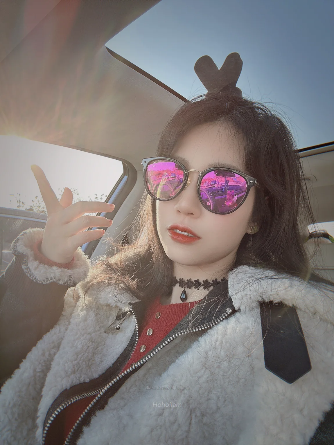 由于我离得近,提早先到了,于是在停车场慵懒的靠车里享受午后阳光,指尖触碰到阳光的感觉,头顶也正好和我的鹿角融为一体😝