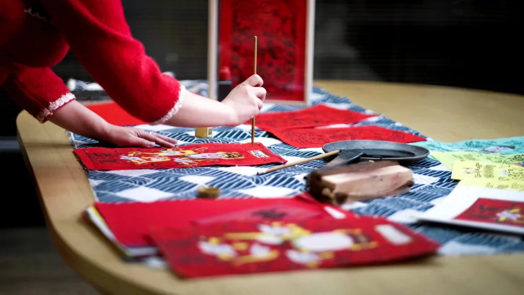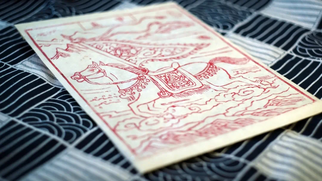 先在版子上刷上一层墨,后将红色的纸盖在版子上,用拓包在纸上均匀地压一遍,一张生动的纸马便跃然纸上,最后点缀上颜色。