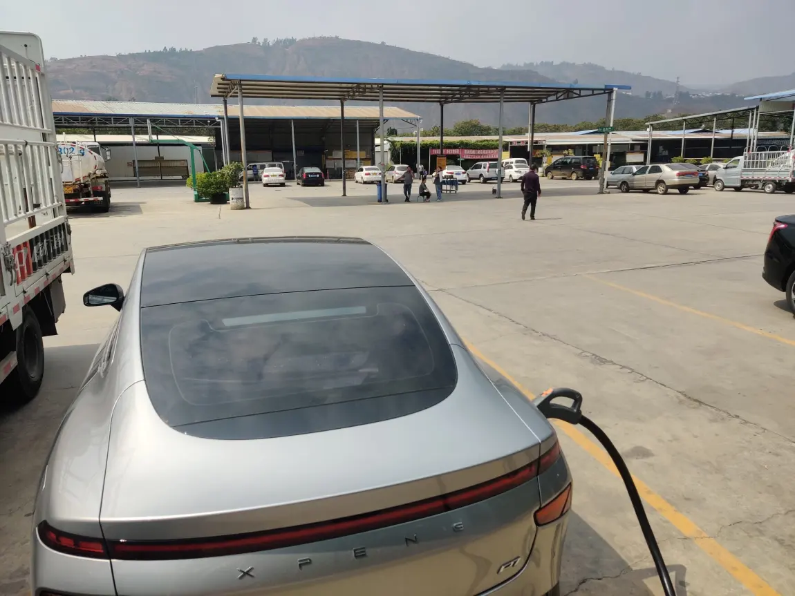下了高速,最近的一个汽车检测站里有一个充电站,距离三公里,给小鹏灌了半个小时的迷汤,向大山前进,前进,前进进!!!