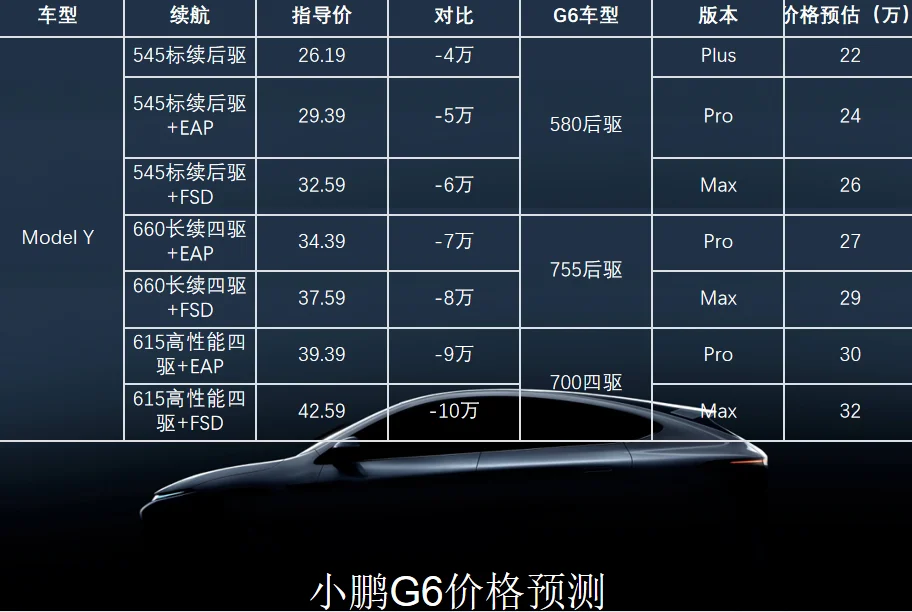 G6相比特斯拉,智能领先 、续航更实、充电更快 、驾控舒适性更好 、更舒适,有四大尖端硬核技术加持:XNGP、800V+3C、一体式铝压铸、CIB电池车身一体化,肯定不便宜,并且自身成本听车评人说也比较贵,对标特斯拉毛豆Y,G6主销款肯定在25+,这图有点可靠,你们觉得呢
