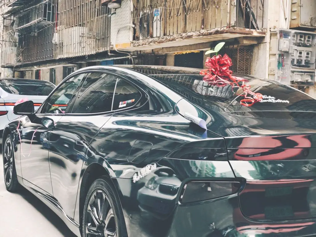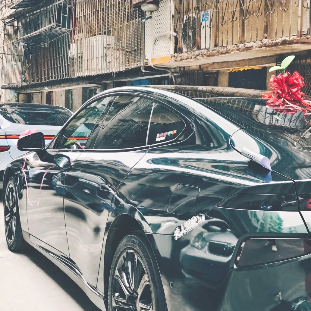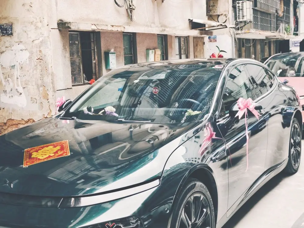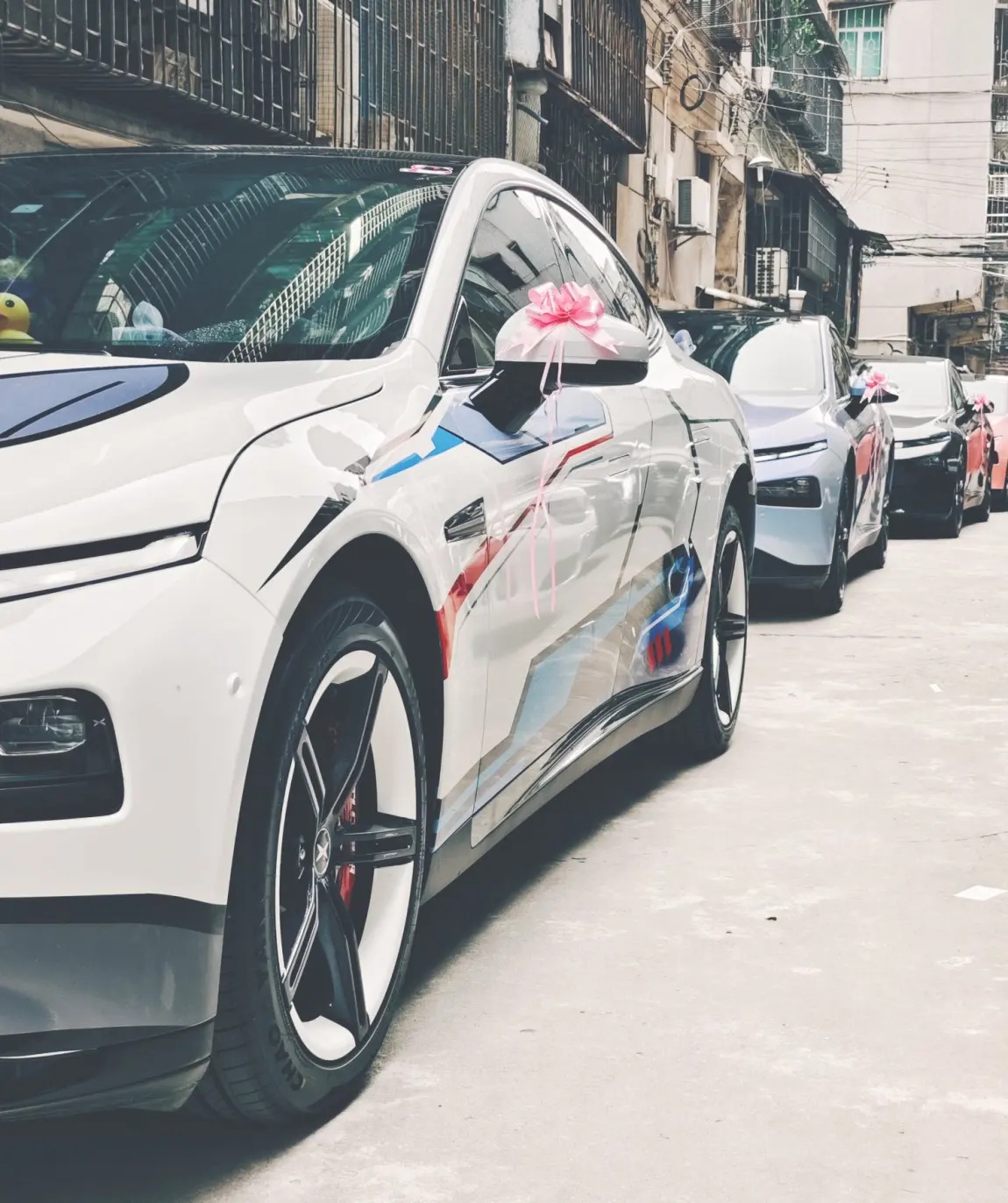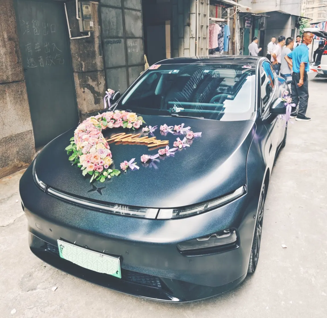 🎊🎊第二天,大家准时在新郎家楼下集合,一起打扮最靓的小鹏p7接亲车队。
