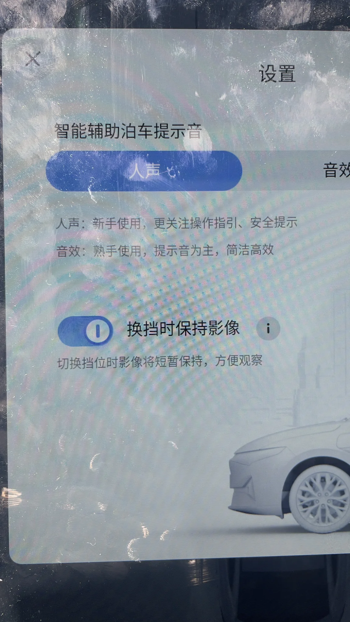 第十个,就是这个换挡时保持影像了!终于!终于更新啦了!从倒车影像中间偏右的设置按钮里可以打开,现在r档切换为d档之后影像会切换为前摄像头并保持前进十米左右。