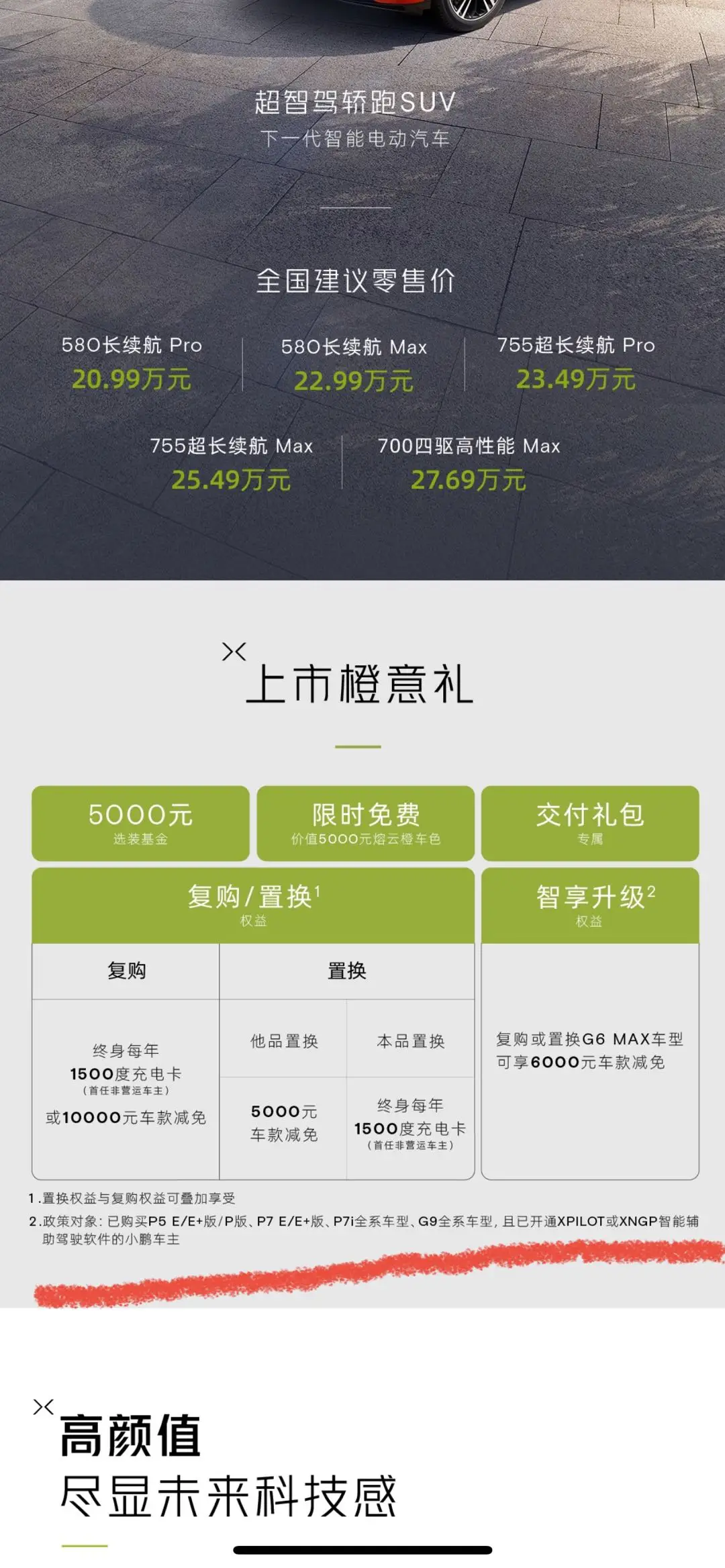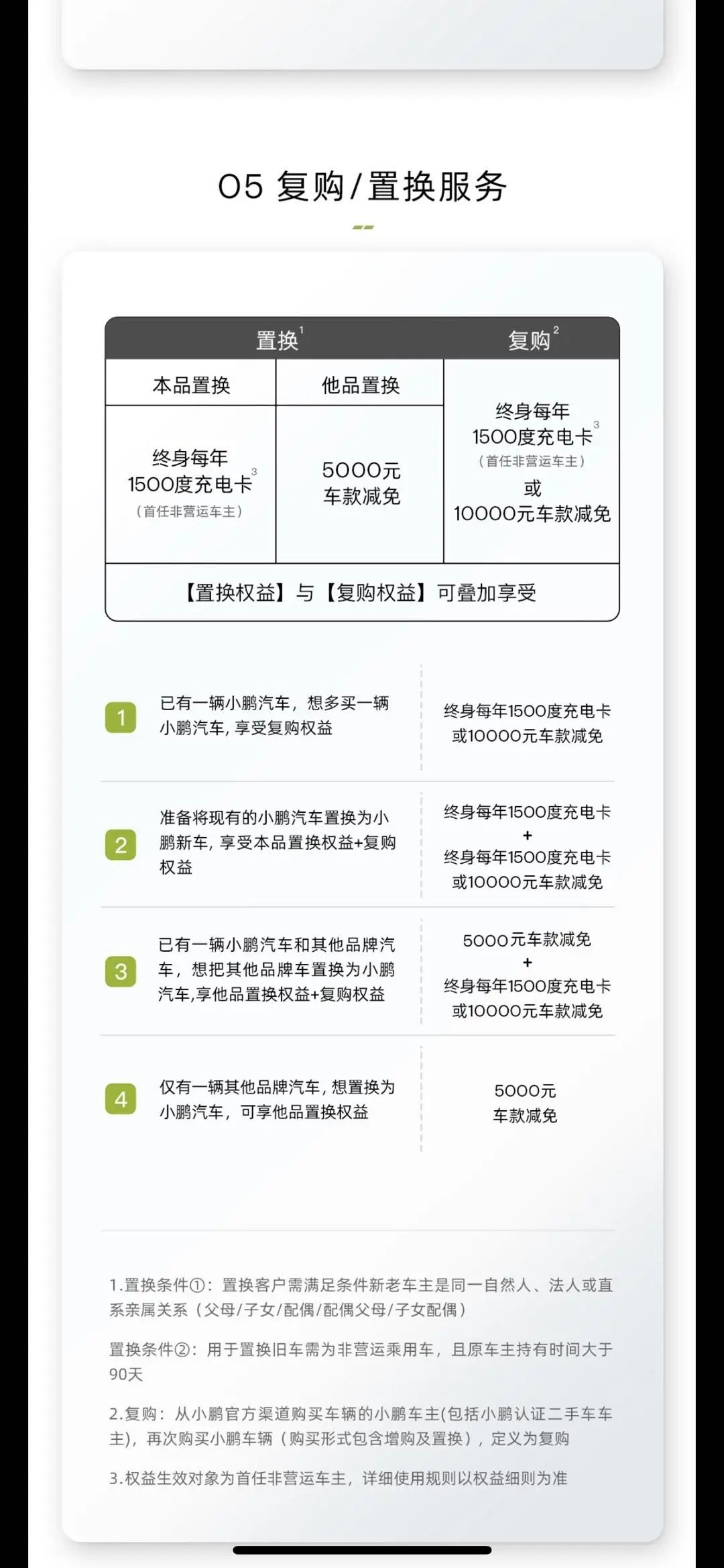 老车主终于感到爱!小鹏旧车置换G6:终身每年1500度电其他车置换G6::减5000元车款复购:终身每年1500度电或1万元车款减免适用对象:P5、P7、G9部分车型(见下图)科普:之前出新车置换都没有送电!这一次的本品置换对于老车主来说实属福音~~感受到小鹏的爱了~也就是说我现在的旧小鹏换一台新小鹏也是送1500度+1500度=3000度3000度电回来了~小鹏格局也打开了~