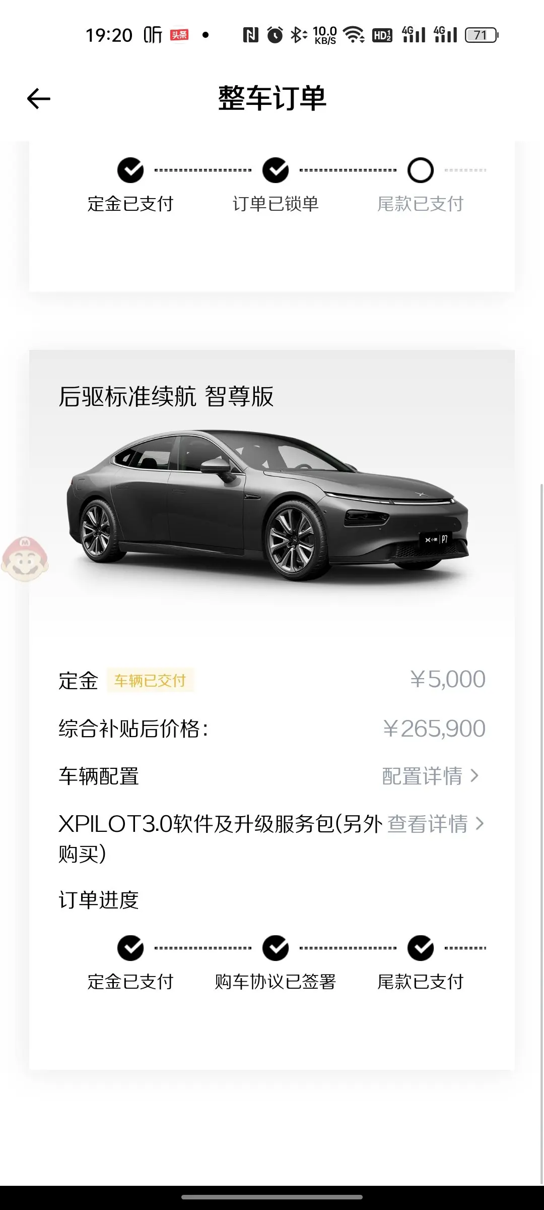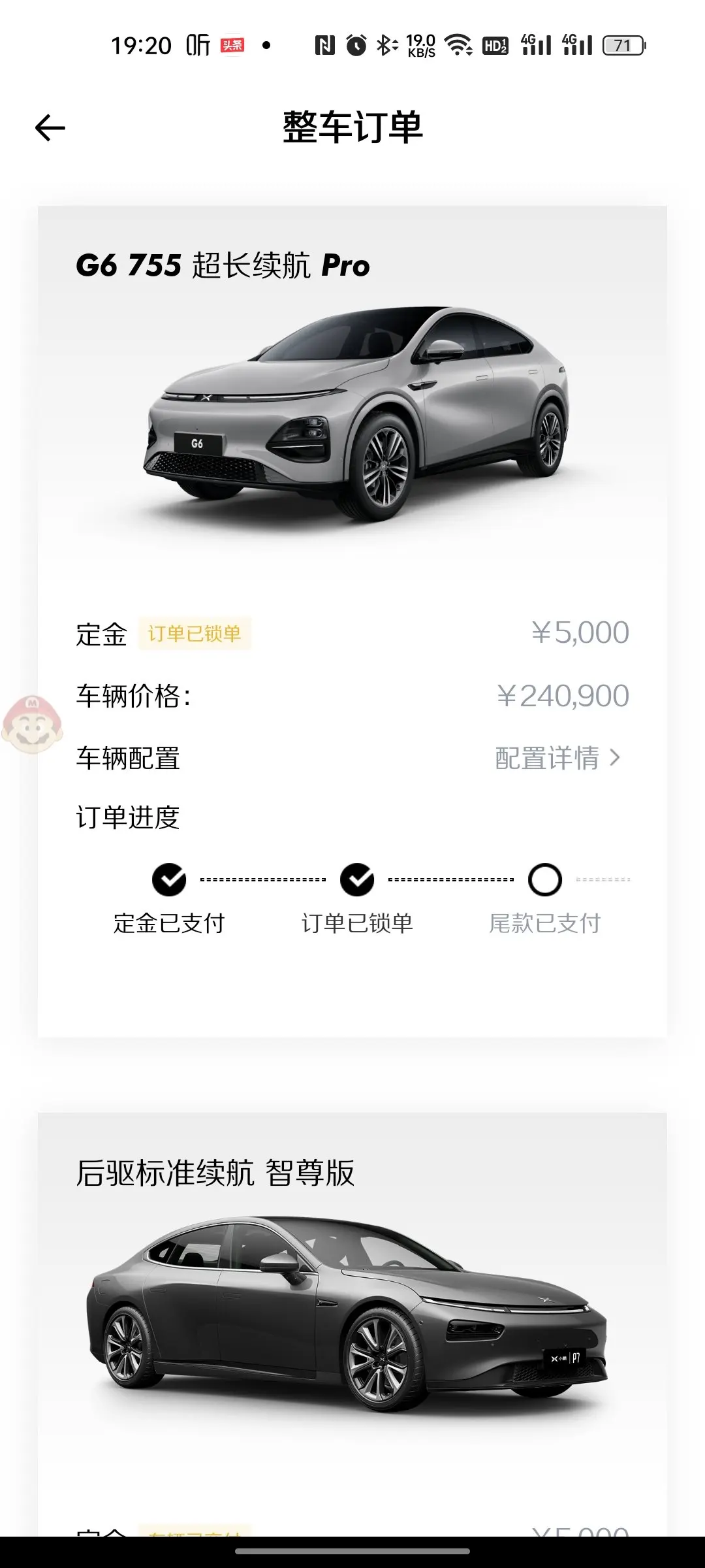P7 480E老车主,禁受不住G6的诱惑,放弃抵抗入坑了!成为尊贵的G6准车主,期待新车!比较可惜我的每年3000度电,变成了1500!单独购买的终身无限流量也没有了,不过不后悔!置换原因其实就是续航太低了!暴力驾驶充100%WLTP表显413km。实际也就跑个三百多一点,所以这是我最大的原因!PS:单踏板是太香了!#与小鹏G6一拍即合#