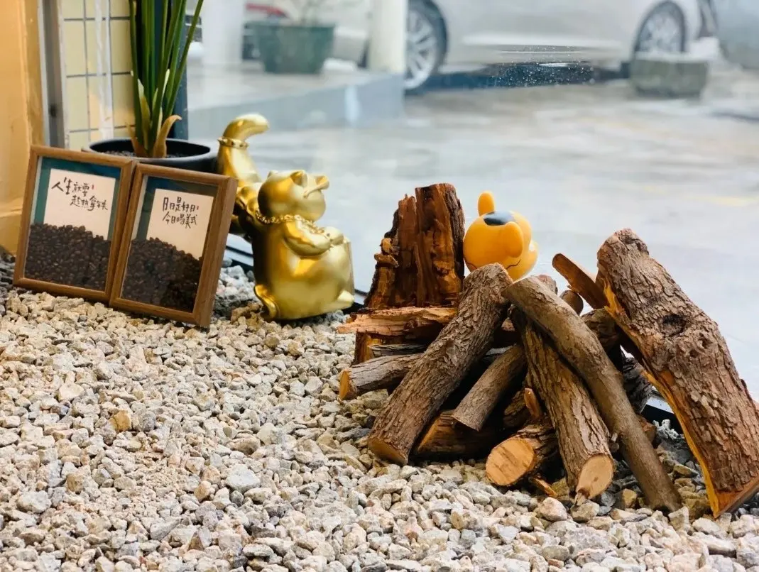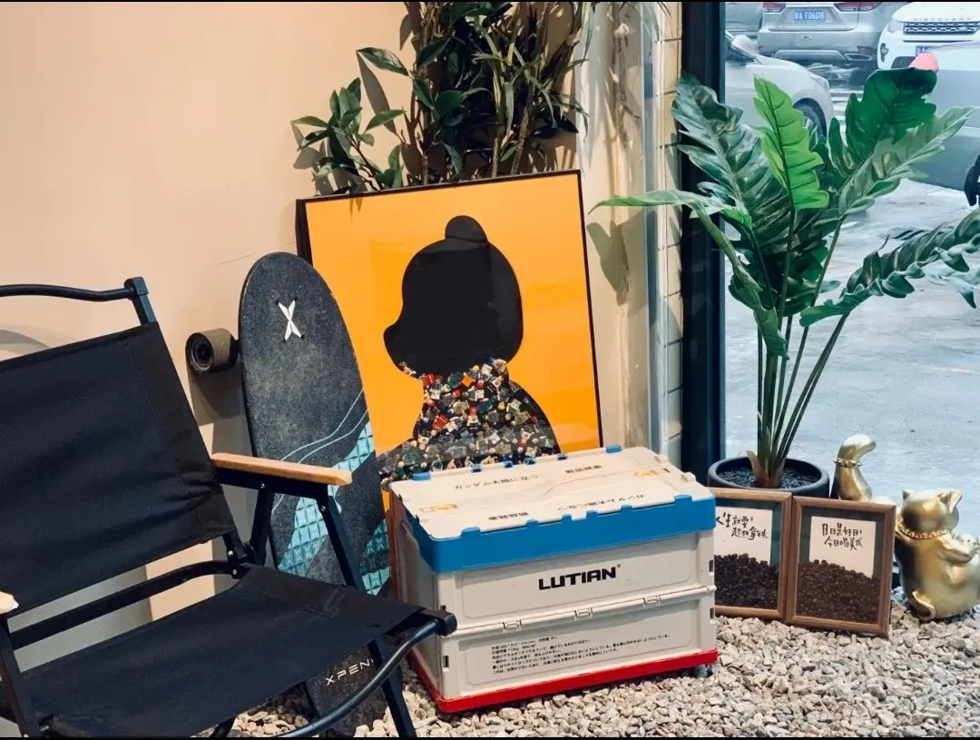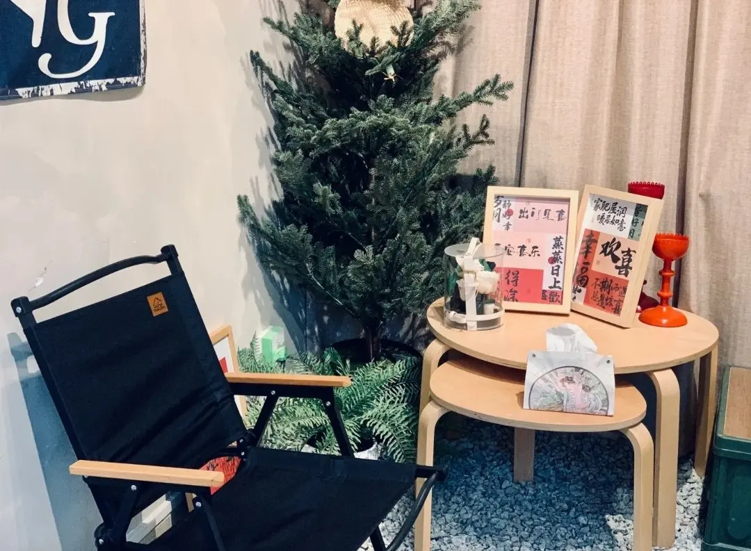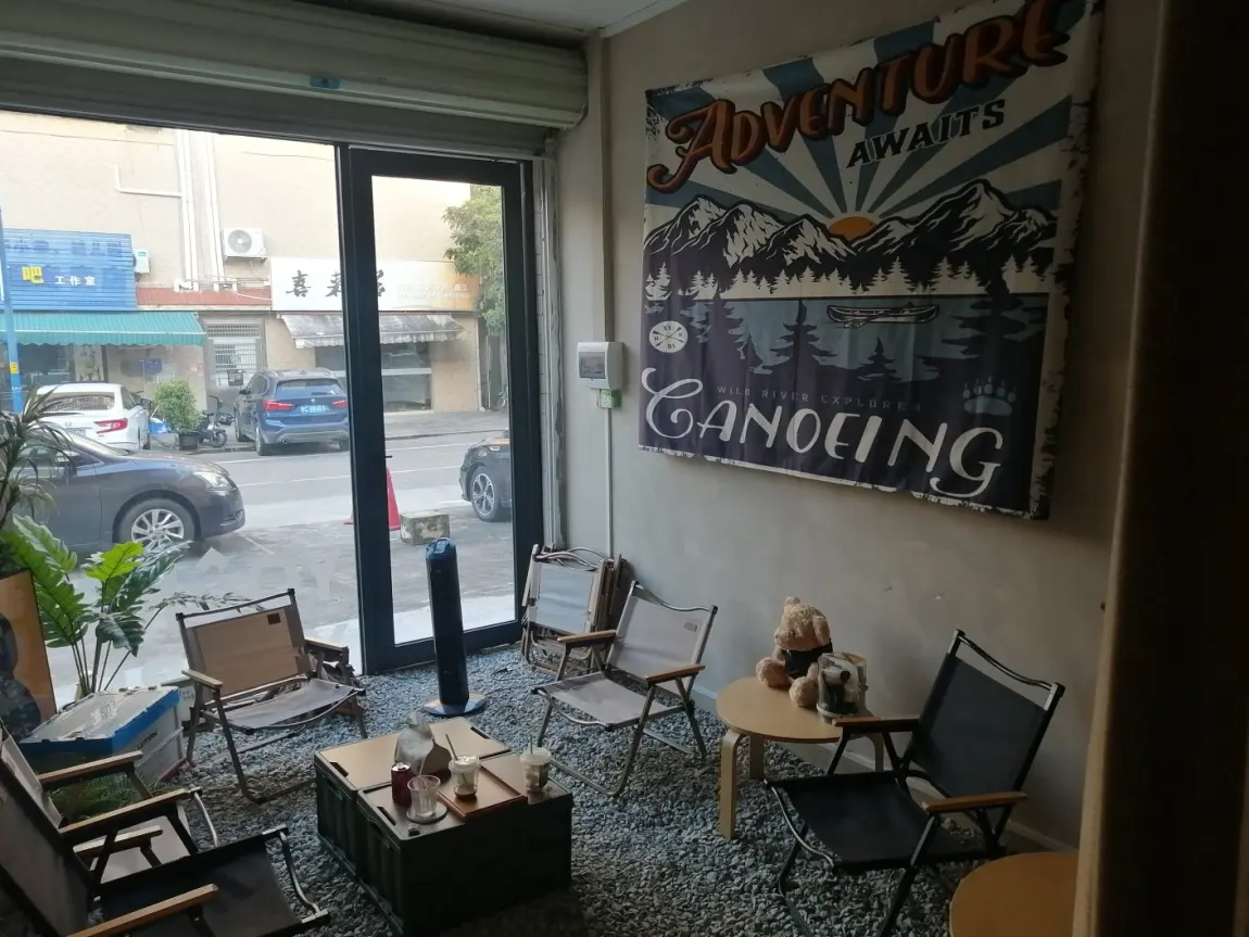 小房间里头是现在很流行的露营地风格🏕️,地面上铺上了小石头,摆上折叠的露营椅子和收纳箱,和外面的英伦风店门风格完全不同,真是很有心思呀,一间店面,两种不同的风格🤙
