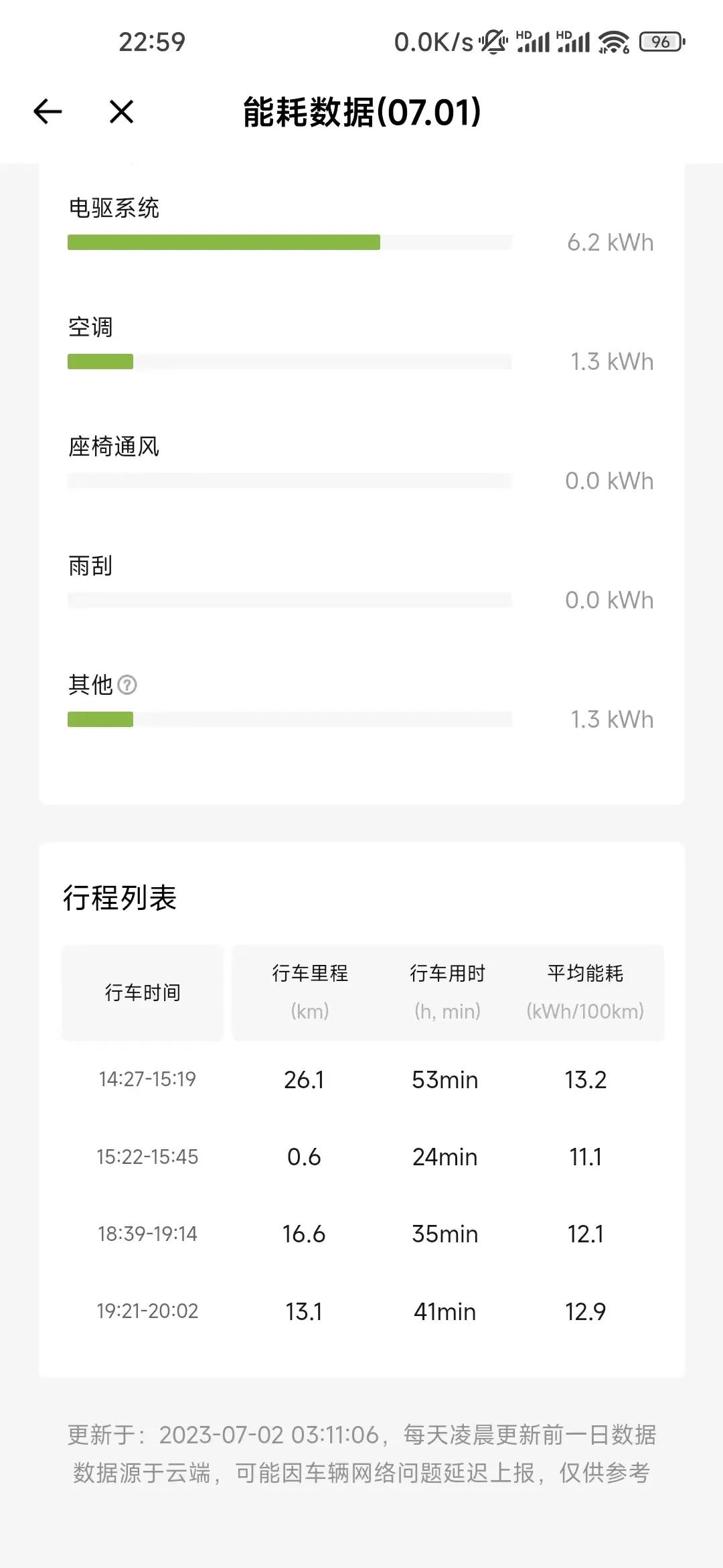 紧接着就是最详细的单日纪录,这个数据也是我点开频率最高的分区,因为可以快速回顾昨日的行驶距离,耗电量及分布,平均车速等,更牛的就是这个行程列表,我每个时段的行驶距离时间电耗都一清二楚。这个我经常用来测算不同的驾驶习惯带来的电耗差异,这个单日能耗和行程记录帮了大忙。