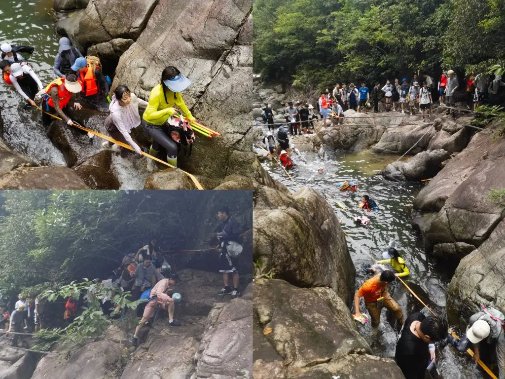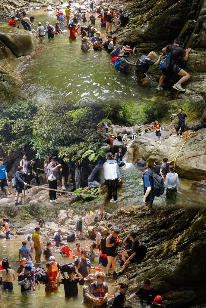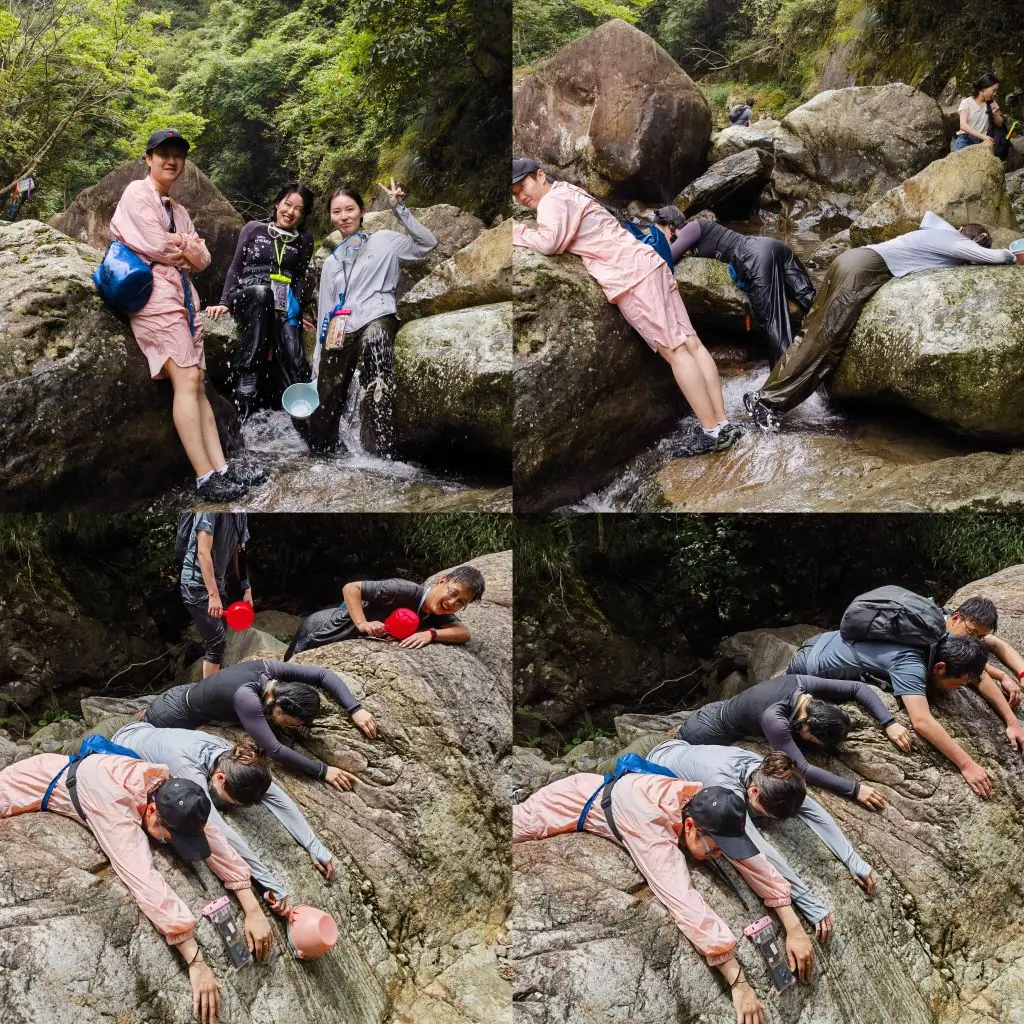 后边的路,还是要小心点走。溯溪全程,不仅有湿滑的苔藓,还有比较深的潭水,一行人走着走着就有同伴滑到在水潭里。好在鹏友们互相帮助,克服了重重困难,接连不断的上山下海,也是挑战了自己心理和身体上的小极限。