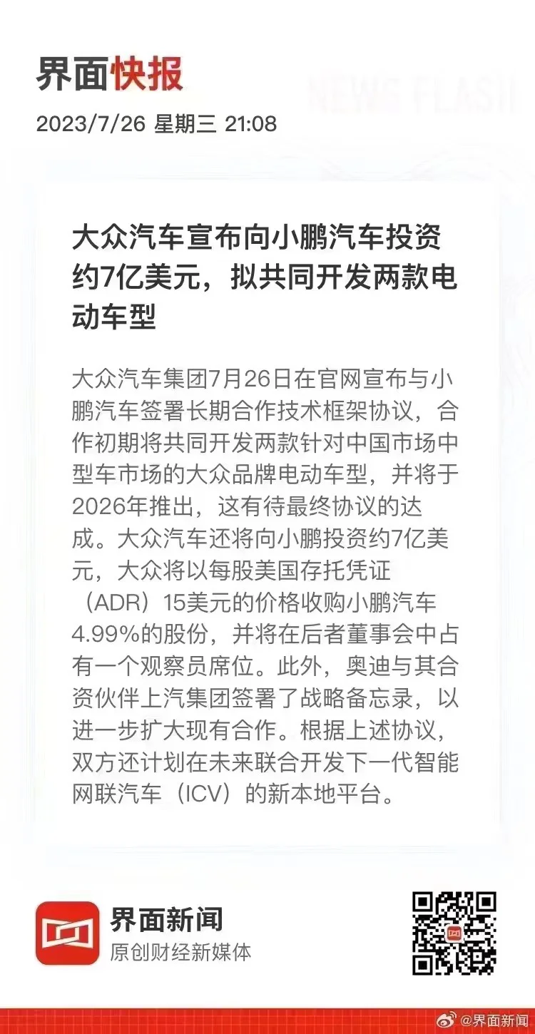 大众投资小鹏,别以后真叫大鹏了吧😓