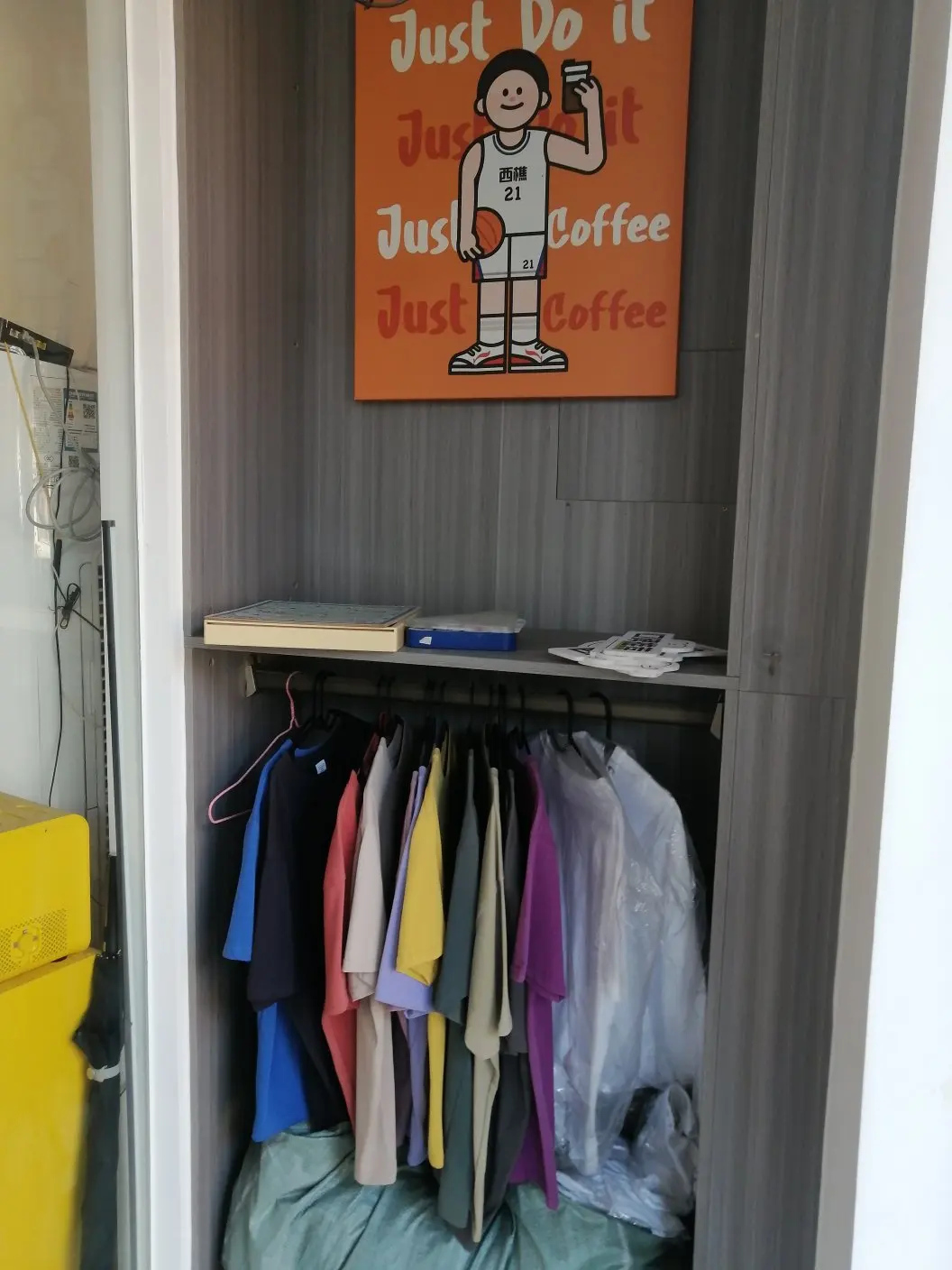 店铺挺大的,在一排沿街商铺的骑楼底,门口有露营椅和桌,坐外面也不会晒🌞。门口还摆着几件衣服,不知道鹏友是否卖咖啡只是副业,主要是卖衣服😂