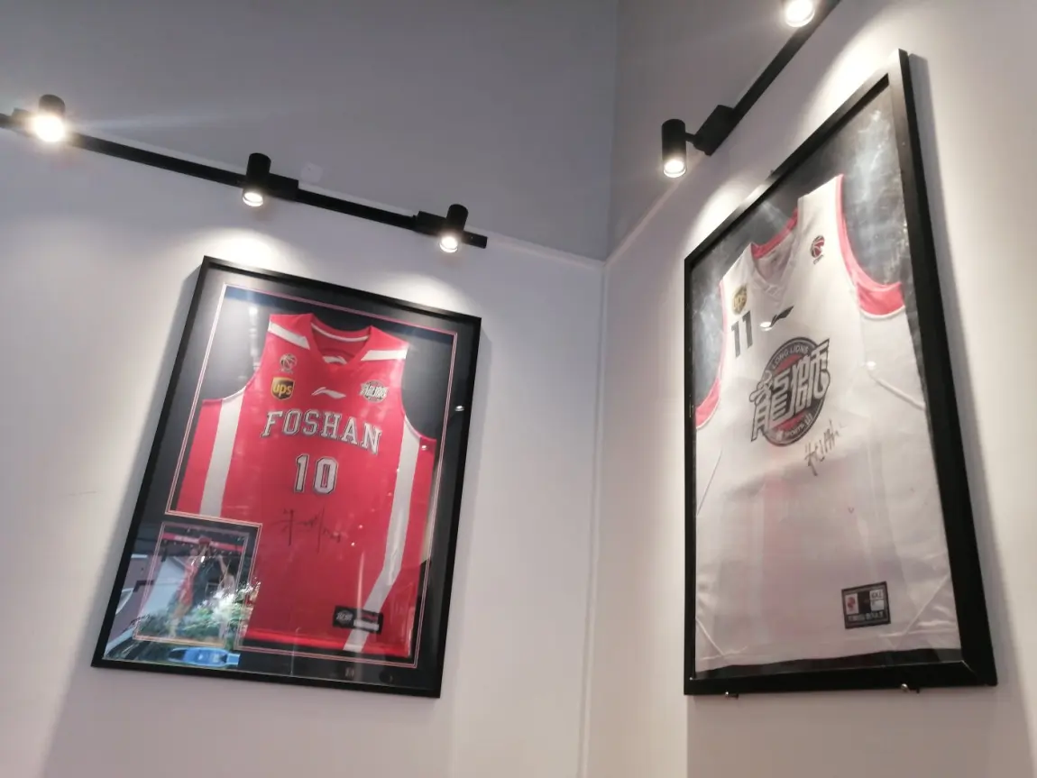 店内装修风格很温馨,一边是吧台,另一边摆着各种桌椅。墙上面还挂着各种篮球元素的小摆设,最显眼的就是两幅用相框裱起来的球衣,两件都是佛山龍狮俱乐部的球衣,还有球员签名,看的出这位鹏友应该是很喜欢篮球的😎