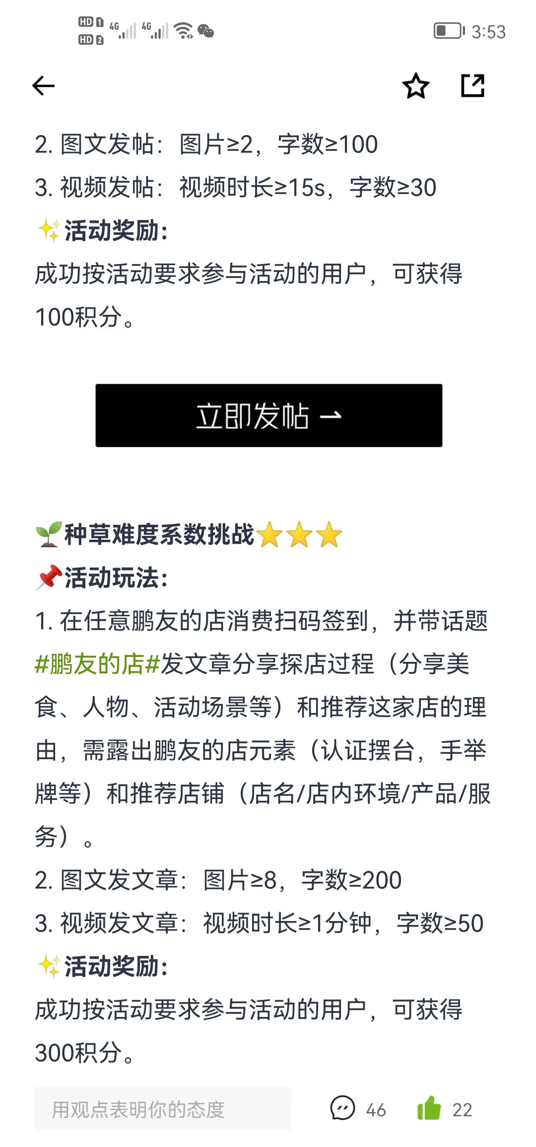 现在来消费店打卡的朋友还有100积分赠送,记得要问老板拿二维码扫登记信息。发帖或者发鹏友算上传到店打卡的照片和撰写探店感受还能获得100积分或更高的300积分。 老板说我是第一位来探店的朋友😂