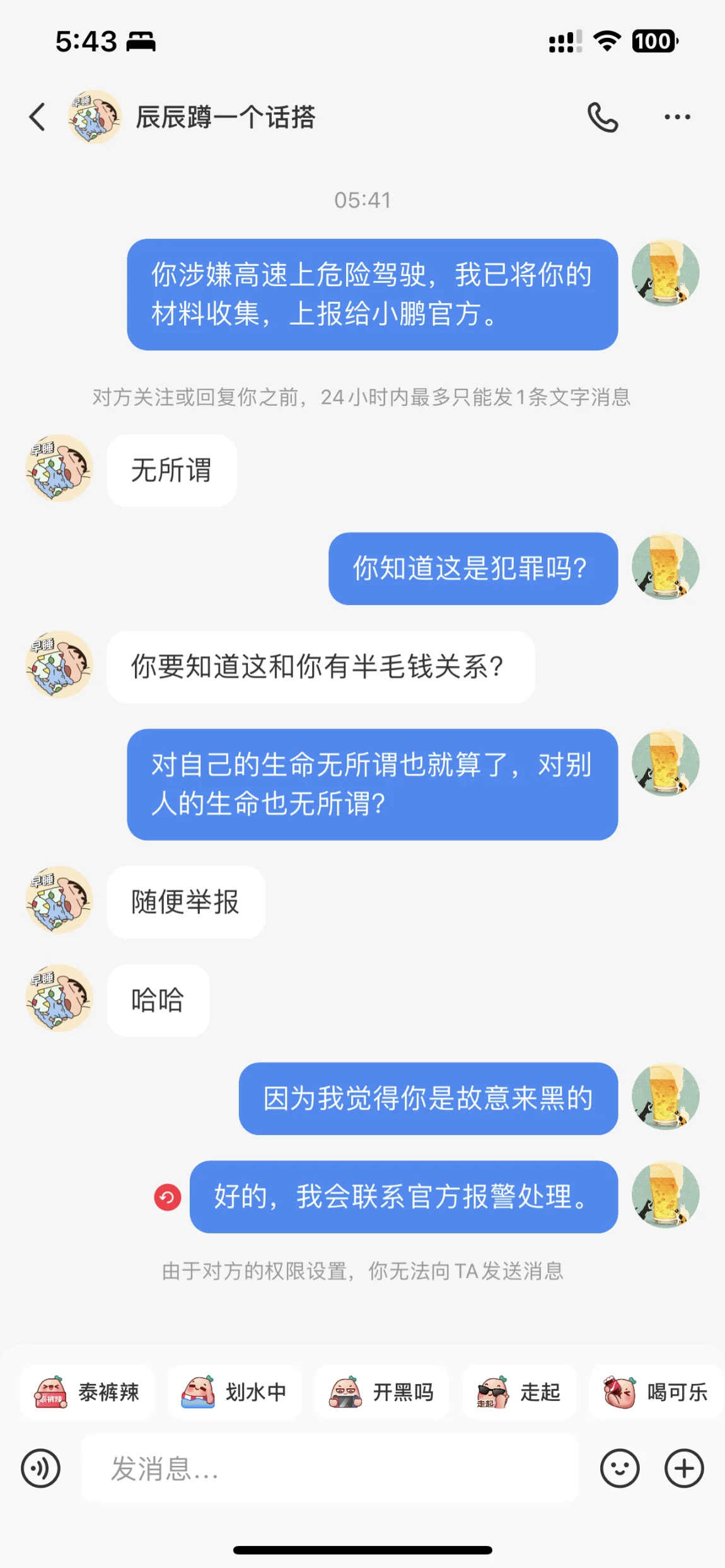 小鹏是一家科技公司,但科技有时候也是双刃剑。作为一名小鹏准车主,也是交通参与者,我不希望在我开车的时候,附近出现这种对自己,对别人不负责任的行为,更不想看见因为滥用自动驾驶技术导致的事故,阻碍这个行业的良性健康发展。